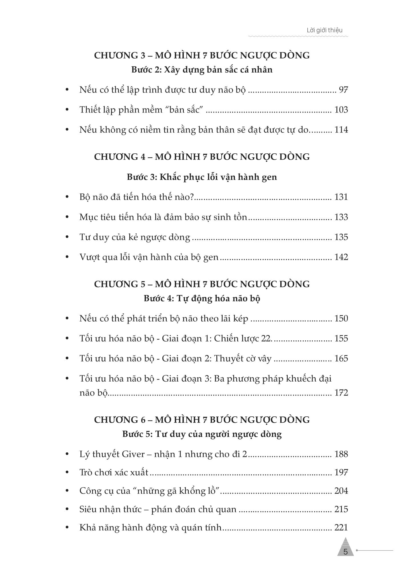 Cuốn sách được chia thành 8 chương chính, với trọng tâm là “Mô hình 7 bước ngược dòng” – một hệ thống tư duy dẫn dắt người đọc từng bước thoát khỏi rào cản tâm lý, di truyền và xã hội để kiến tạo tự do thực sự.