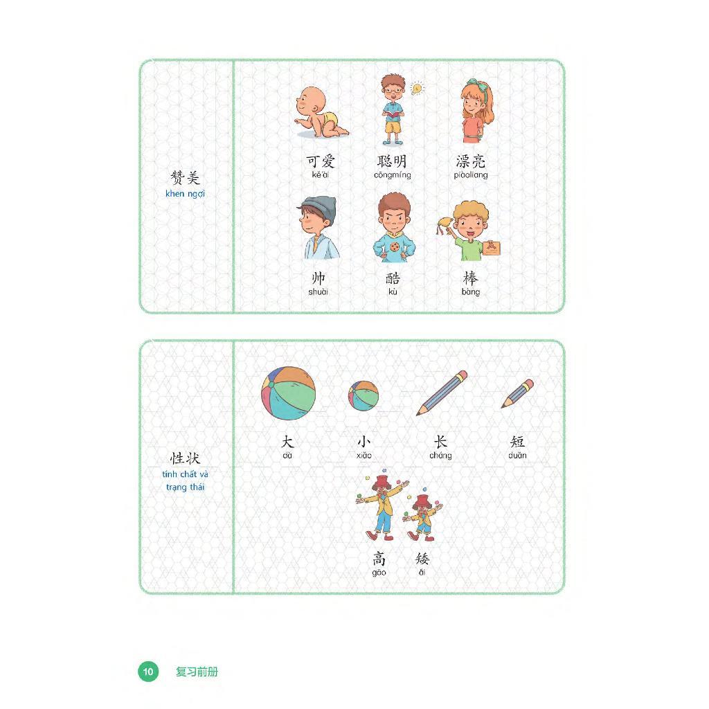 Giáo trình tiếng Trung dành cho học sinh tiểu học – Sách bài học – Tập 2 bao gồm 12 bài học. Sau ba bài học sẽ có một bài ôn tập. Sách có sử dụng các từ vựng và mẫu câu quan trọng trong giáo trình Tiếng Trung dành cho học sinh tiểu học – Sách bài học – Tập 1 để học sinh có thể ôn lại bài cũ trong bài học mới. Phần đầu sách có mục “Những cách diễn đạt thường gặp trong lớp học”, tiếp theo là bài giới thiệu sơ lược về chữ Hán. Bài giới thiệu này sẽ giúp học sinh hiểu toàn diện về chữ Hán và có nền tảng vững chắc để học chữ Hán về sau. Cuối sách là “Bảng từ vựng”, “Bảng chữ Hán để đọc và nhận biết”, “Bảng chữ Hán để viết và nhận biết”.