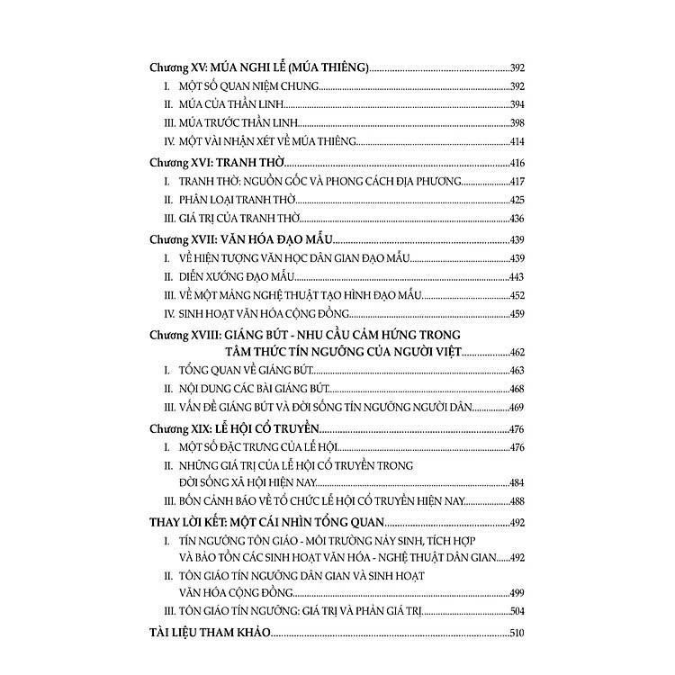 Cuốn sách "Tín ngưỡng và văn hoá tín ngưỡng ở Việt Nam" giới thiệu một số tín ngưỡng và văn hoá tín ngưỡng ở Việt Nam: tín ngưỡng các tộc người ở Việt Nam, tín ngưỡng thờ cúng tổ tiên, tín ngưỡng thờ Thành hoàng làng, tín ngưỡng thờ Mẫu, tín ngưỡng Đức Thánh Trần, tín ngưỡng nghề nghiệp, mẫu thần Chăm, bà Chúa xứ, mẫu thần đa văn hoá...