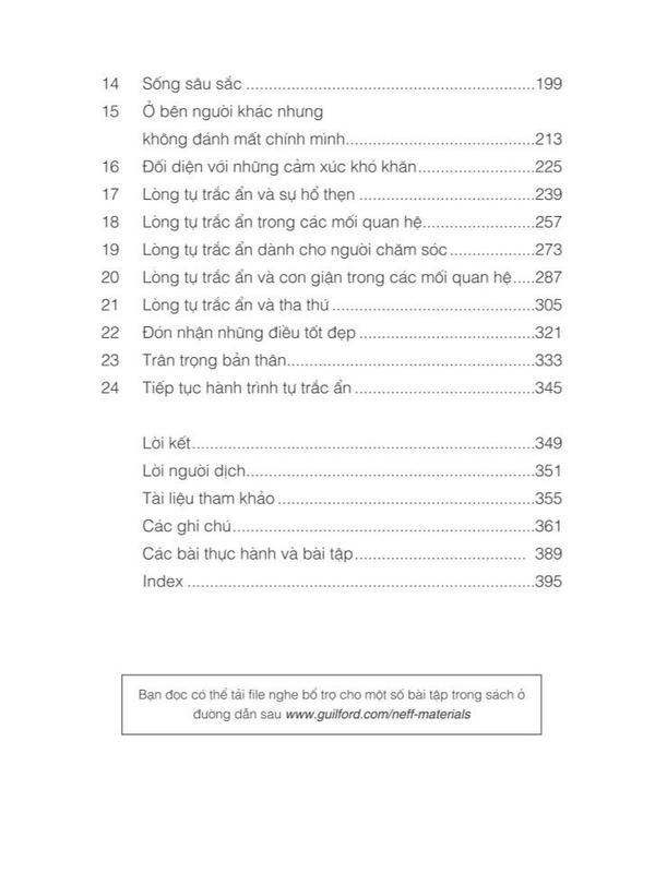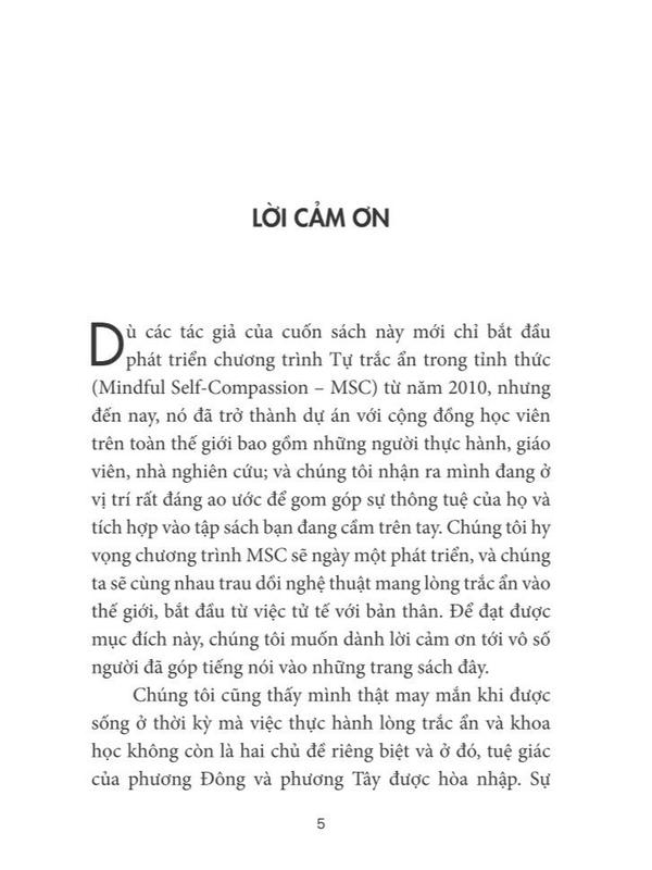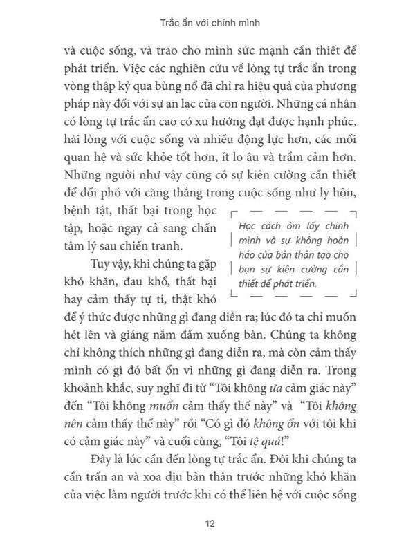 Trắc ẩn với chính mình là cuốn sách dựa trên cơ sở khoa học, bao gồm các bài thiền có hướng dẫn; tập quán thức có thể thực hiện mọi lúc, mọi nơi. Qua đó bạn sẽ biết cách thoát khỏi những phán xét gay gắt về bản thân và những tiêu chuẩn bất khả thi, nhằm giải quyết căng thẳng trong mối quan hệ cũng như các vấn đề thể chất lẫn tinh thần khác để nuôi dưỡng cảm giác hạnh phúc.