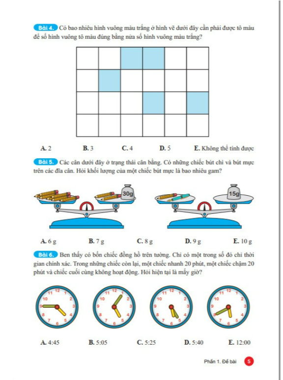 – Phần một bao gồm hệ thống các câu hỏi trắc nghiệm và tự luận. Bên cạnh các dạng toán cơ bản, bám sát chương trình giáo dục phổ thông 2018, các em còn được tiếp cận rất nhiều dạng bài phong phú và hấp dẫn, thường xuất hiện trong các kì thi Toán quốc tế ở bậc Tiểu học. Chúng tôi sắp xếp một cách tương đối câu hỏi trong cuốn sách theo thứ tự từ cơ bản, gợi mở đến nâng cao để luôn khuyến khích học sinh tiếp tục vượt qua những thử thách ở mức độ cao hơn mỗi khi hoàn thành được một nhiệm vụ trước đó. Tuy nhiên, các em không nhất thiết phải làm theo thứ tự, mà có thể chọn một cách sắp xếp phù hợp với