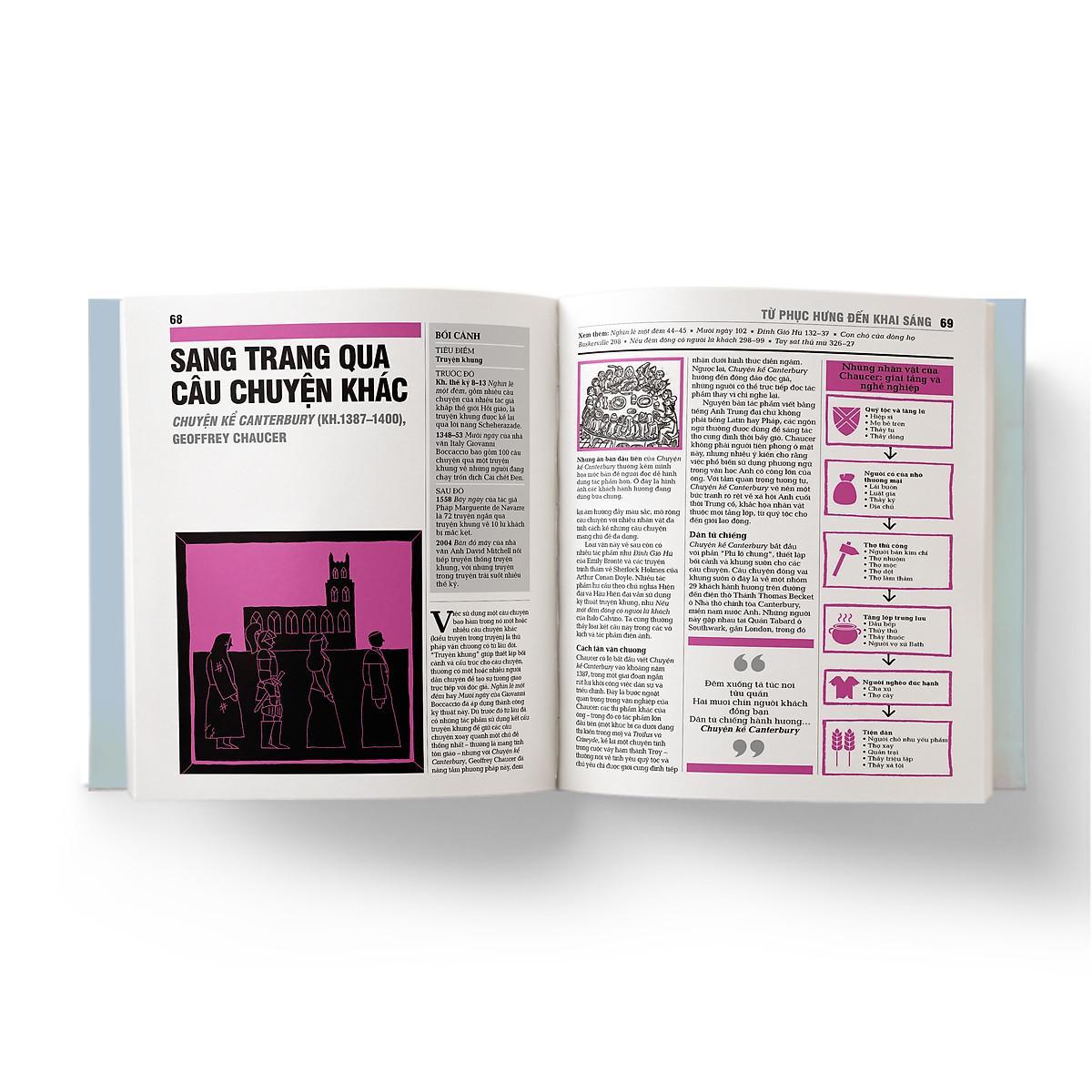 “Cuốn sách bạn đang cầm trên tay là một hành trình diễu qua lịch sử văn học, với hơn một trăm tác phẩm làm cột mốc dọc đường. Hướng tiếp cận của sách mang tính toàn cầu, tìm hiểu các áng văn chương từ nhiều nền văn hóa đa dạng có thể hãy còn xa lạ đối với nhiều bạn đọc. Những cái tên được chọn trong sách, có thể là ví dụ tiêu biểu cho một phong cách hoặc kỹ thuật viết nào đó, hay đại diện cho một hội nhóm hoặc trào lưu đã mở ra hướng đi mới được các cây bút đương thời tiếp nhận, hoặc trở thành tiền đề để đời sau mở rộng khai thác. Các tác phẩm được xếp theo trật tự thời gian để nhấn mạnh sự nổi lên của những cách tân văn chương theo bối cảnh chính trị xã hội của chúng. Ví dụ, trong thế kỷ 17 và 18, văn học Pháp đã phát triển từ hài kịch châm biếm xã hội Tân cổ điển của Molière sang lối đả kích ngầm trào phúng theo chủ nghĩa lạc quan Khai sáng của Voltaire, rồi sau này là những khắc họa trần trụi về sự suy đồi của giới quý tộc Pháp như trong Les Liaisons dangereuses của Pierre Choderlos de Laclos, xuất bản chỉ vài năm trước khi Cách mạng Pháp xảy ra. Những biến chuyển này trong văn học có sự chồng lặp không thể tránh khỏi, do các kỹ thuật tiên phong được một số nhà văn khai sáng ra cần có thời gian để trở nên chính thống, trong khi những người khác thì vẫn tiếp tục đi theo phong cách truyền thống từ các thời đại trước”. (Trích Văn học – Khái lược những tư tưởng lớn)