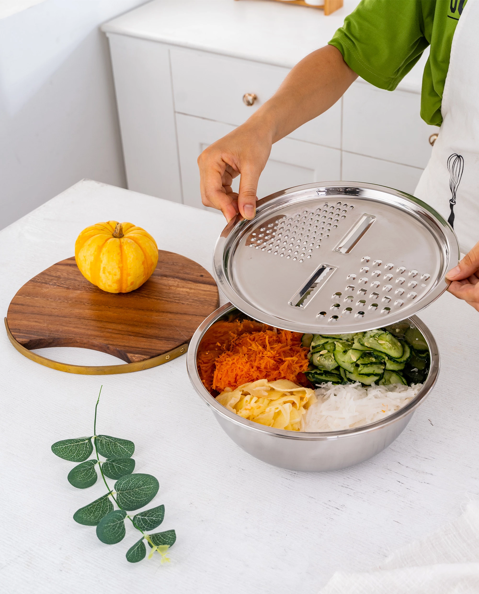 -Bộ nạo đa năng, giúp bào sợi rảu củ quả tiện dụng. ngoài ra còn có thể được dùng như nắp đậy trên rổ để bảo quản đồ bên trong tránh được côn trù