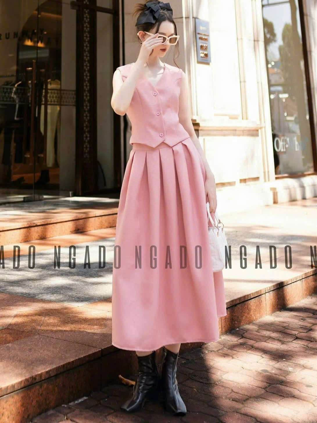 ✨Set hồng áo gile chân váy xoè xếp ly NGADO , set áo váy xoè