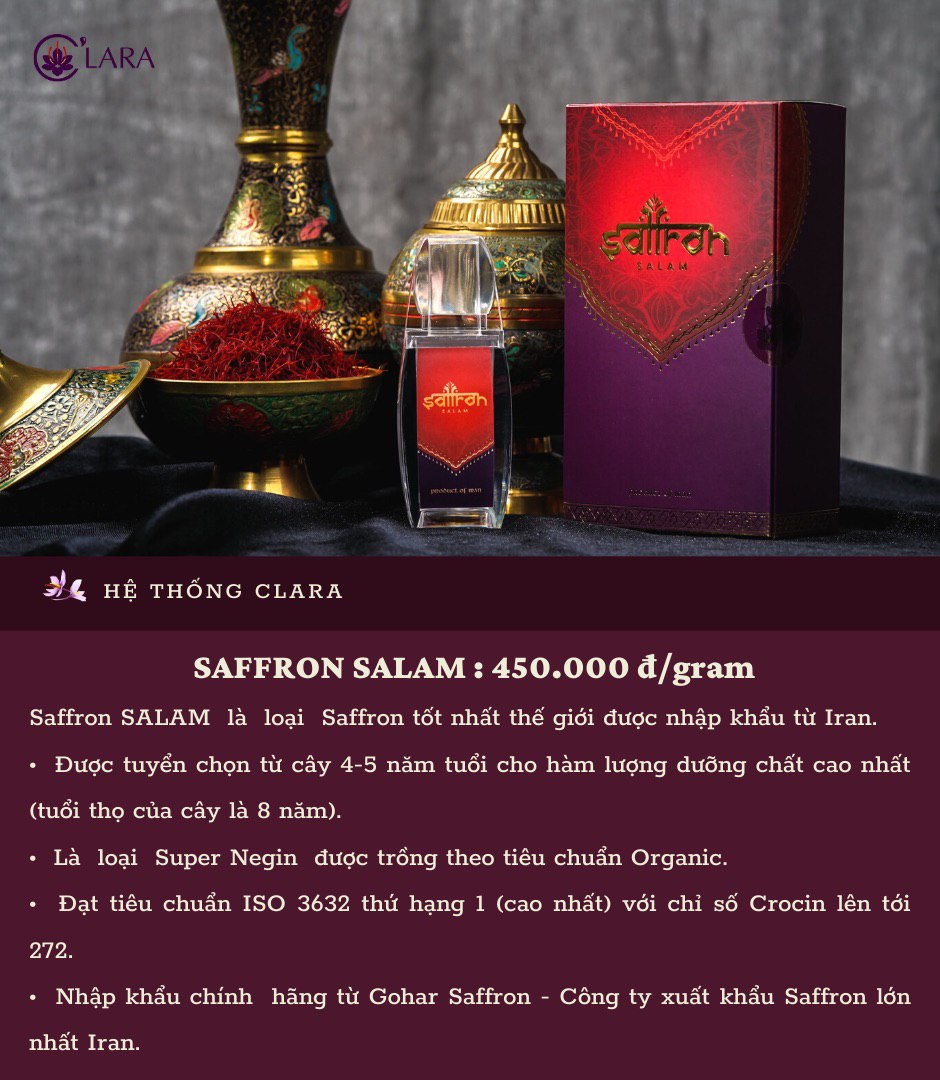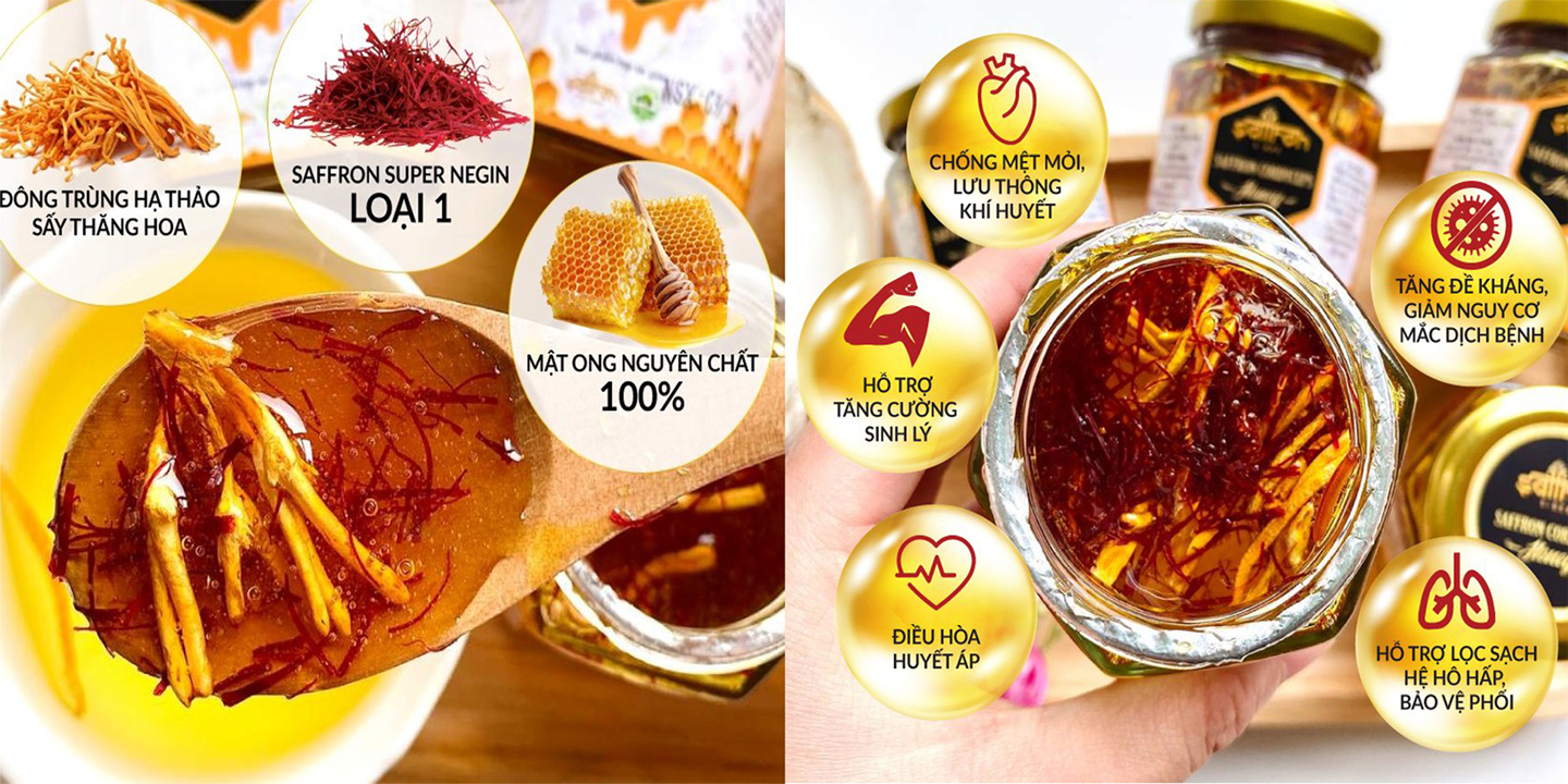 Bộ quà quà bao gồm: 1 gr Saffron Salam 1 giai lệ trà 1 Hũ Mật ong Saffron Đông trùng hạ thảo Bộ vỏ hộp và túi sang trọng thích hợp để biếu tặng. HSD: