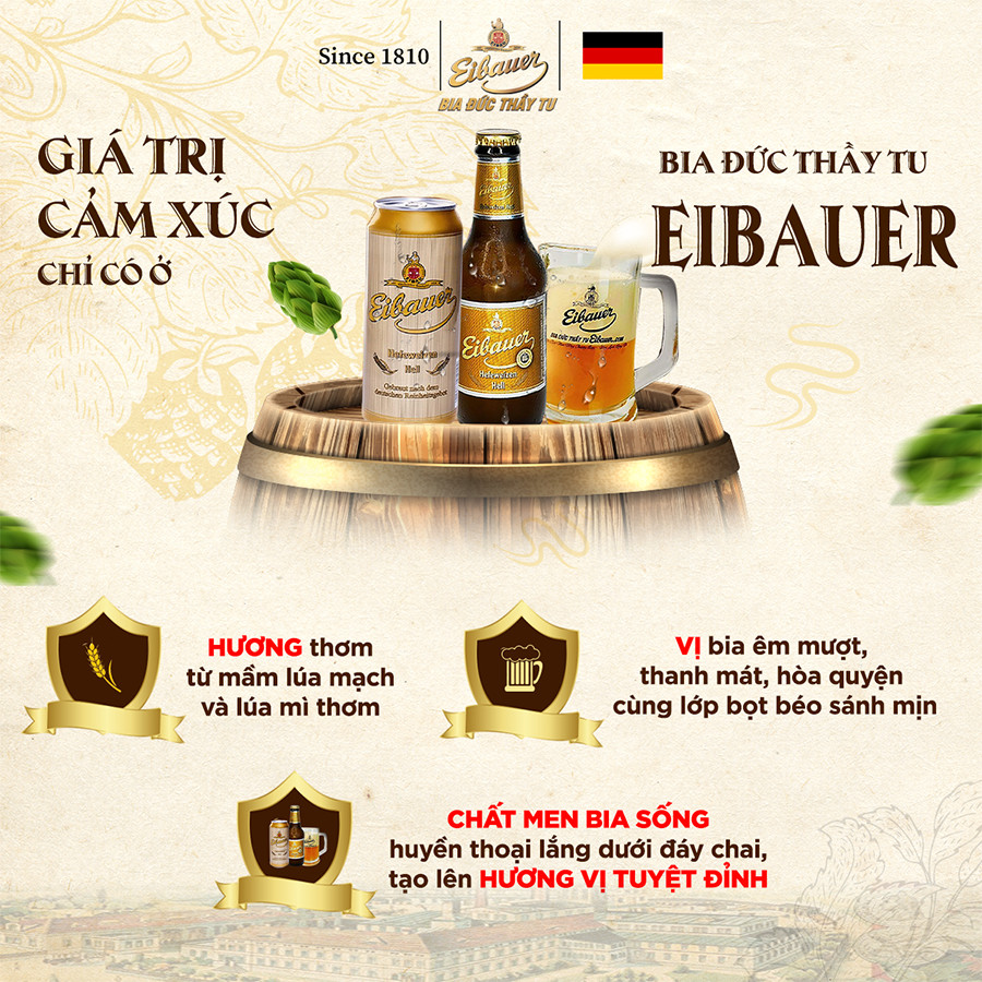 Mua tại Tiktok[SINCE 1810] Bia Đức Thầy Tu Eibauer Vàng 5.2 ĐỘ - Lên Men Tự Nhiên Thượng Hạng - Nhập Khẩu Chính Hãng Xuất xứ & Nơi sản xuất / Origin: Đức / Germany Nồng độ cồn / Alcohol content: 5.2% vol Màu sắc bia / Colour of beer: 13.6 EBC Độ đắng / Bitternes units: 15.3 BU Thành Phần : Hoa bia, mạch nha thơm, men bia sống, nước cất tinh khiết. HSD 18 tháng kể từ ngày sản xuất LỊCH SỬ BIA 200 NĂM: Năm 1810 nhà máy bia Eibauer đầu tiên được vua của Saxony – Frederick Augustus I (1806-1827), cho phép xây dựng theo công thức làm bia một vị thầy tu xứ Eibauer, người đam mê nghệ thuật ủ bia và sáng tạo ra chất bia với hương vị tuyệt đỉnh lừng danh hơn 200 năm. Bia Vàng Eibauer - 5.2% Vol : Dòng bia hoàn hảo để nuôi dưỡng cảm xúc, giải tỏa căng thẳng mệt mỏi, chỉ vài ngụm bia vàng thầy tu Eibauer cảm hứng lại tuôn trào, năng lượng lại dạt dào, nhẹ nhàng lâng lâng sảng khoái Chỉ cần so sánh với bất kỳ thức uống khác về độ cân bằng êm mượt, sự hấp dẫn của hương thơm tự nhiên, hậu vị mượt mà thuần khiết, bạn sẽ dễ dàng cảm nhận được đẳng cấp thượng hạng và hương vị tuyệt hảo của bia vàng Eibauer mà không có dòng bia nào có thể so sánh được. Vẻ đẹp thuần túy của một ly Eibauer vàng 5.2 vol. Ai đã thử thì khó lòng bỏ qua Màu sắc: sắc vàng sánh đậm đặc trưng Mùi thơm: Hương thơm mạch nha phảng phất dễ chịu bắt nguồn từ mạch nha và hoa bia vùng Hallertau. Vị : Eibauer thấm dần nhẹ nhàng qua từng ngụm khiến cho người uống ngỡ ngàng về độ mạnh mẽ một cách từ tốn, không phô trương nhưng đầy đẳng cấp. Ở những ngụm đầu tiên, một cảm giác tê nhẹ nơi đầu lưỡi, sự cân bằng mềm mại giữa vị ngọt của mạch nha và vị đắng thanh mát đặc trưng của hoa hops. Lớp bọt là các hạt mịn bồng bềnh, hài hòa trong dòng chảy sóng sánh. Bia Độc Tôn Eibauer Đức CÓ ĐIỂM GÌ KHÁC BIỆT? Men bia: Bia lên men tự nhiên lắng dưới đáy chai Bọt bia: Lớp bọt tự nhiên sánh mịn, bùi béo Cồn: Cồn được sinh ra trong quá trình lên men tự nhiên, được ủ tối thiểu 48 ngày Giá trị sức khỏe: Không gây nhức đầu, bổ sung men đường ruột Hương vị: Hương vị tự nhiên từ lúa mì, lúa mạch, hoa hốp Hướng dẫn bảo quản: Bảo quản ở nhiệt độ thường, nơi khô ráo, thoáng mát, tránh xa ánh nắng mặt trời. Bảo quản trong tủ lạnh nhiệt độ từ 9 đến 11 độ C cho có bia chất lượng bia tốt nhất. Hướng dẫn sử dụng: Bia ướp lạnh sâu, nhiệt độ lý tưởng là 10°C, màu bia sẽ chuyển từ vàng đỏ qua màu vàng chanh sóng sánh, hương quyện lại, vị đậm sâu là lúc bạn sẽ hiểu vì sao hương vị của nó lại lưu luyến lòng người đến thế. Lắc nhẹ đều lon/chai bia trước khi rót. – Không uống với đá, hương vị sẽ bị tàn phá vì nếu uống với đá, bia sẽ loãng ra, nhạt dần… rất khác với các loại bia ít hương vị, hay các loại bia sử dụng chất tạo hương, tạo vị