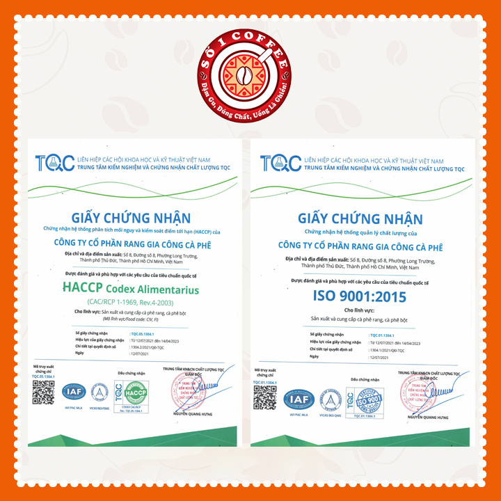 - Nhà máy rang xay cà phê chuẩn ISO & HACCP, chuẩn ATVSTP bảo vệ sức khỏe cho người dùng