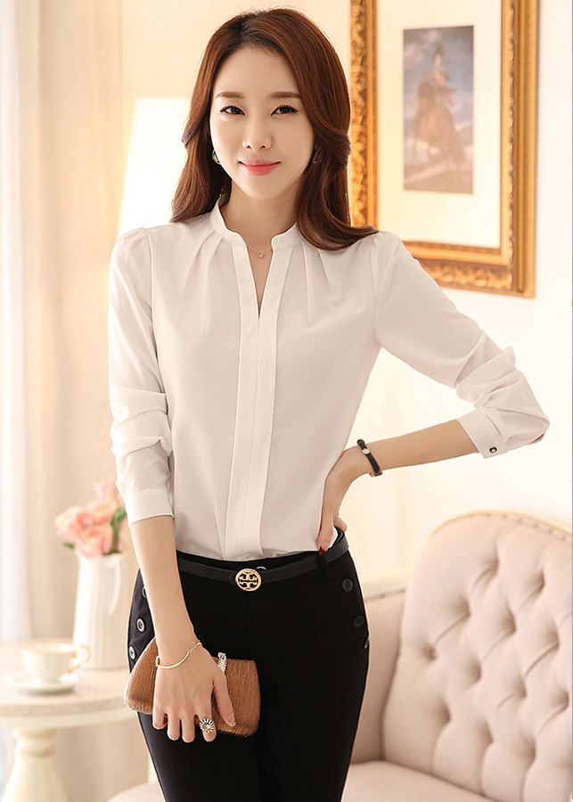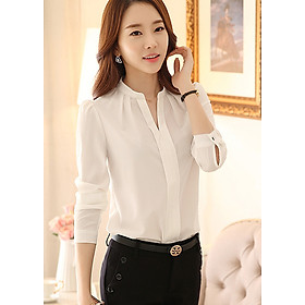 Kiểu dáng: áo sơ mi công sở cổ tim thanh lịch, phối nút duyên dáng, tay dài cài nút phong cách phù hợp công sở, công tác, đi dạy, đi học, đi tiệc Chất liệu: