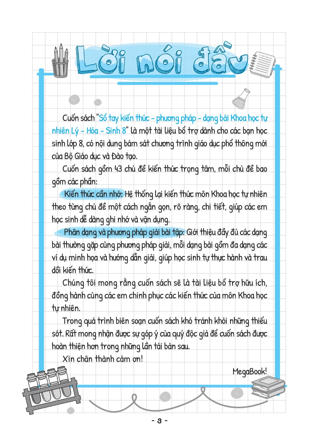 "Sổ tay kiến thức - phương pháp - dạng bài Khoa học tự nhiên Lý - Hóa - Sinh Lớp 8" là tài liệu bổ ích dành cho học sinh lớp 8, bám sát chương trình giáo dục phổ thông mới. Cuốn sách giúp các em nắm vững kiến thức Khoa học tự nhiên theo từng chủ đề với cách trình bày ngắn gọn, rõ ràng và dễ hiểu. Các dạng bài tập thường gặp được giới thiệu chi tiết, kèm theo phương pháp giải cụ thể và nhiều ví dụ minh họa sinh động. Với cuốn sổ tay này, học sinh không chỉ ôn tập hiệu quả mà còn tự tin vận dụng kiến thức vào thực tế.