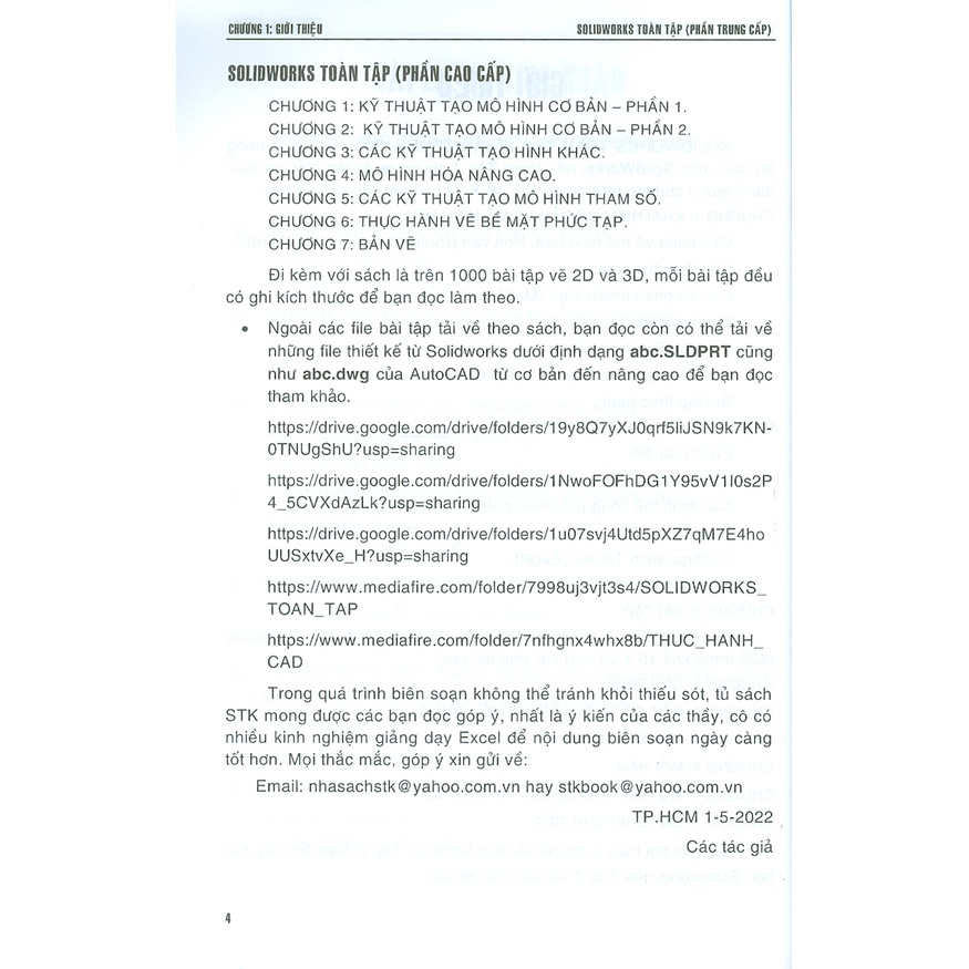 "Solidworks là phần mềm CAD 3D có thể tăng tốc quá trình thiết kế của bạn và giúp bạn làm việc hiệu quả hơn - cho phép bạn cung cấp các sản phẩm sáng tạo ra thị trường nhanh hơn. Bộ sách Solidworks do tủ sách STK thực hiện gồm 5 tập dựa trên phiên bản Solidworks mới nhất tại thời điểm đó là Solidworks 2021 gồm: