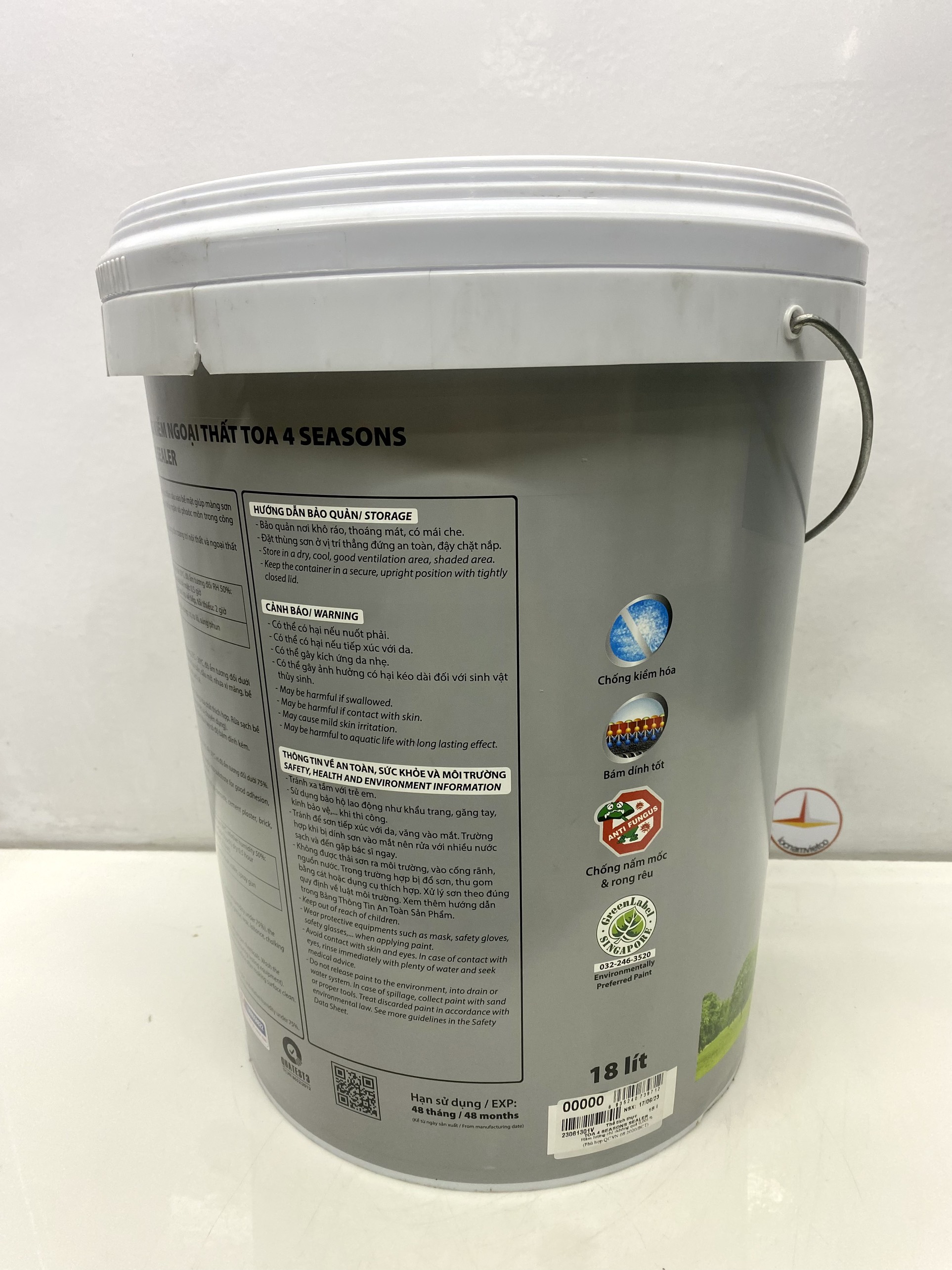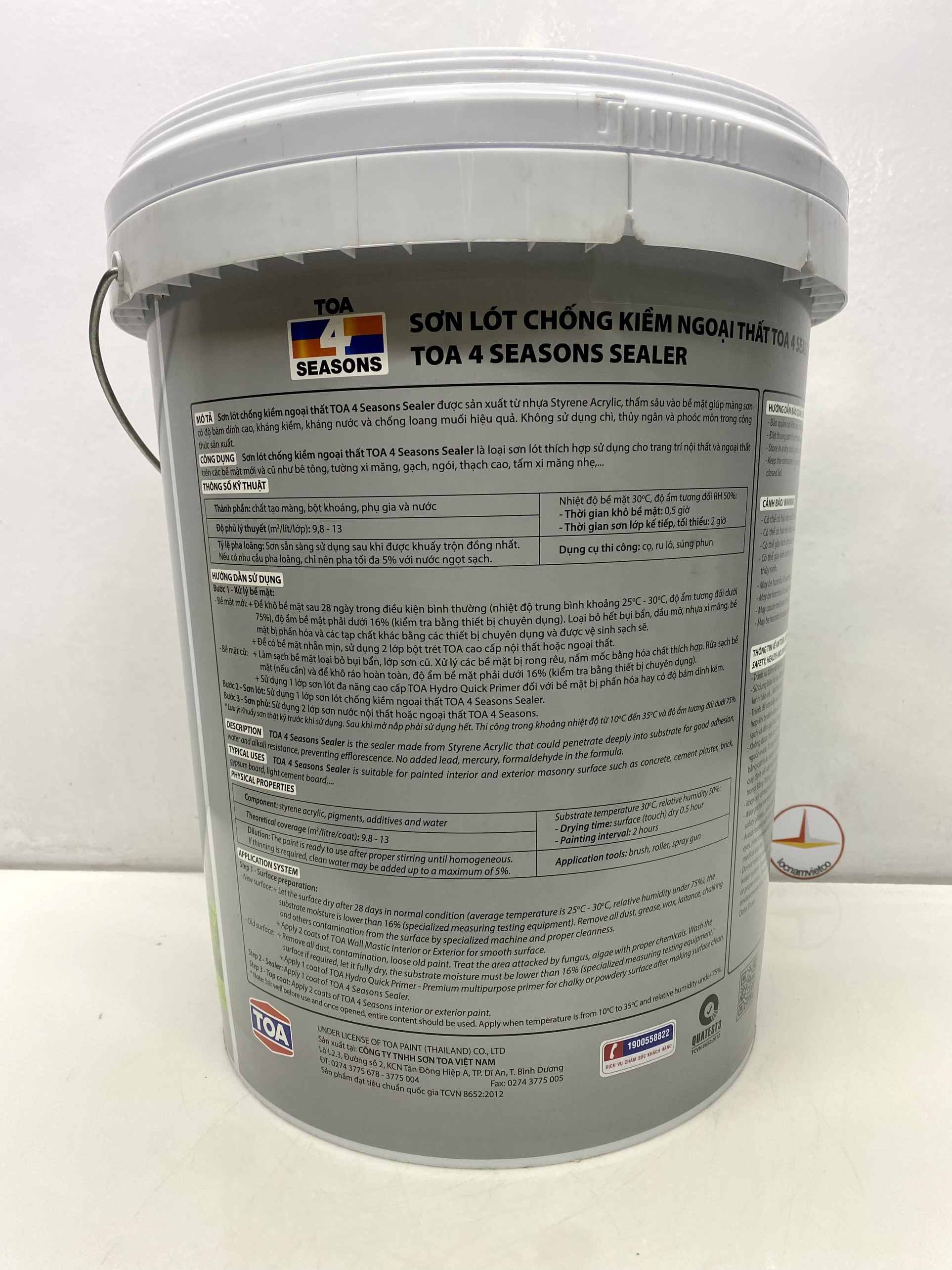 Mua tại TiktokSơn lót chống kiềm ngoại thất Toa 4 Seasons Sealer _18L Sơn lót chống kiềm Ngoại thất TOA 4 Seasons Sealer là loại sơn lót được sản xuất từ nhựa Styrene Acrylic, thấm sâu vào bề mặt mang lại màng sơn độ bám dính cao, kháng kiềm, kháng nước và chống loang muối hiệu quả. Sản phẩm không chứa Chì, Phoóc-môn.