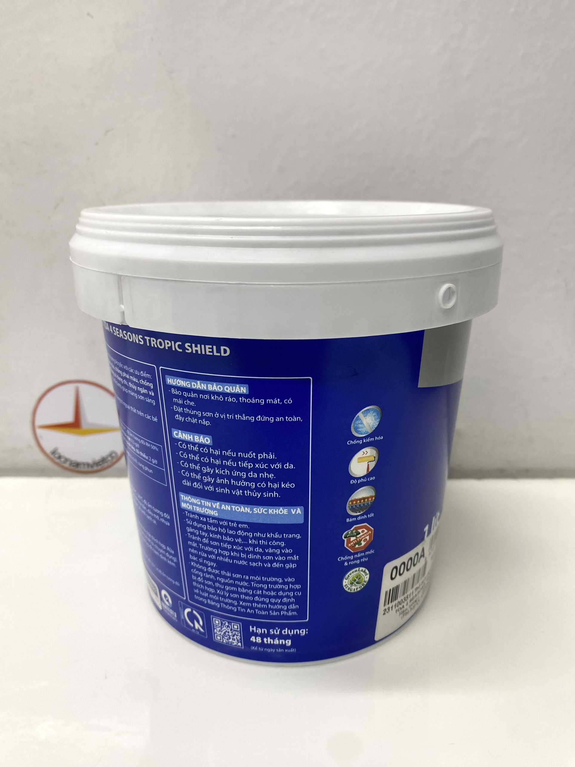 Chứng nhận Green label  MỤC ĐÍCH SỬ DỤNG: Sơn Nước Toangoại thất TOA 4 Seasons Tropic Shield thích hợp cho việc trang trí nội thất trên các bề mặt mới và cũ như bê tông, tường xi măng, bê tông, thạch cao, gạch, ngói, tấm xi măng nhẹ, v.v...  ĐẶC TÍNH SẢN PHẨM: · Thành phần cấu tạo: Chất tạo màng, Bột khoáng, Nước. · Màu sắc: Một số màu sơn chỉ phào chỉ được lựa chọn nhiều hiện nay: Hồng 8096, Hồng 8081, 8094, 8063,8031,8046, gạch 8022, 8037, đỏ 8061, vàng 7870, 7910,7822, xanh lá mạ 7742, 7703, 7653, xanh ngọc 7592, 7567, 7502, xanh da trời 7434,7376,7407, 7327, 7271, 7294,7358,7263, đen 8253,8333, Trắng, Nhũ vàng · Bề mặt hoàn thiện: Mờ · Thể tích chất rắn: 37 ± 2 (% theo thể tích) · Độ phủ lý thuyết: 10 – 12 m2/lít/lớp Độ phủ thực tế sẽ phụ thuộc vào khả năng dàn trải của màng sơn, độ dày màng sơn khô, bề mặt thi công, tay nghề thợ sơn và lượng sơn hao hụt thực tế khi thi công. ·Hàm lượng chất hữu cơ bay hơi (VOCs): ≤ 50 g/l  Thời gian khô ở nhiệt độ 30 oC: khô bề mặt 30 phút ; khô cứng:4h  Đóng gói: 1lít Dụng cụ: Cọ, ru-lô/con lăn, súng phun sơn thông thường Tỷ lệ pha loãng:Sơn sẵn sàng sử dụng sau khi được khuấy trộn đồng nhất. Nếu có nhu cầu pha loãng, chỉ nên pha tối đa 5% với nước ngọt sạch. *Lưu ý: Khuấy sơn thật kỹ trước khi sử dụng. Sau khi mở nắp phải sử dụng hết. Thi công trong khoảng nhiệt độ từ 10°C đến 35°C và độ ẩm tương đối dưới 75%. Nhận giao hàng: Vũng Tàu, Bình Dương, Bình Phước, Long An, Đồng Nai, TP.HCM gửi hàng đi Toàn Quốc giá rẻ.