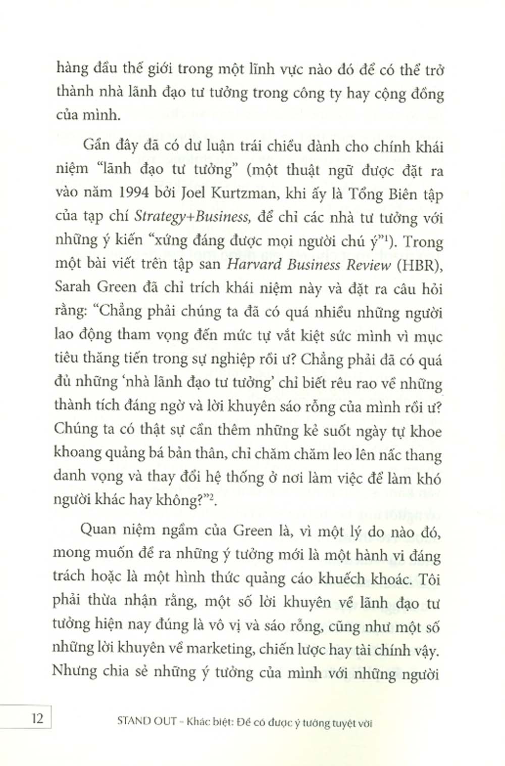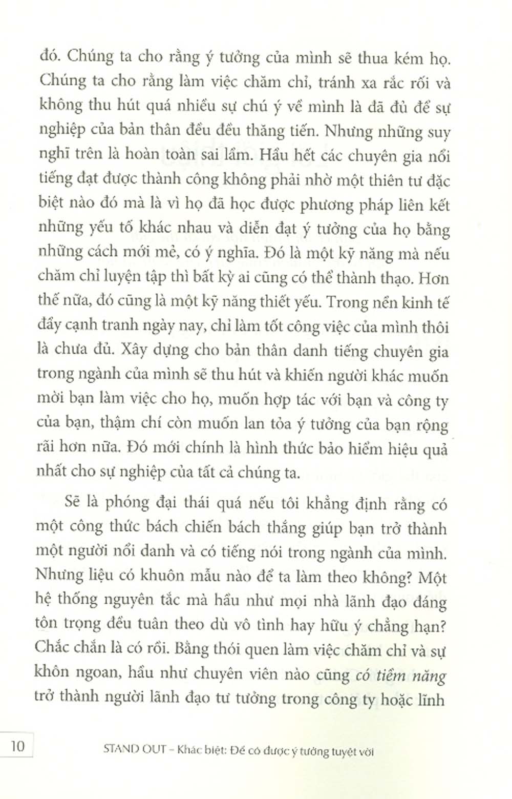 Chắc chắn không có một công thức chung mà mọi người đều thành công, nhưng khẳng định có một hệ thống nguyên tắc mà các nhà lãnh đạo tài ba đều tôn trọng. Và chúng được viết lại với một cách dễ hiểu hơn, dễ thực hành hơn trong Stand out: How to Find Your Breakthrough Idea and Build a Following Around It.