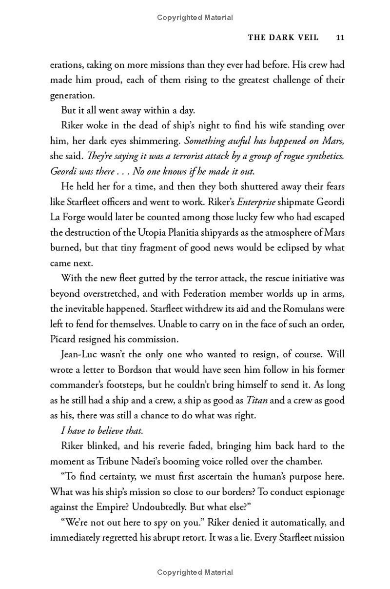 Within the United Federation of Planets, a terrorist strike on the shipyards of Mars has led to the shutdown of all relief efforts for millions of Romulans facing certain doom from an impending supernova. But when the USS Titan is drawn into a catastrophic incident on the Romulan-Federation border, Captain William Riker, his family, and his crew find themselves caught between the shocking secrets of an enigmatic alien species and the deadly agenda of a ruthless Tal Shiar operative. Forced into a wary alliance with a Romulan starship commander, Riker and the Titan crew must uncover the truth to stop a devastating attack—but one wrong move could plunge the entire sector into open conflict!