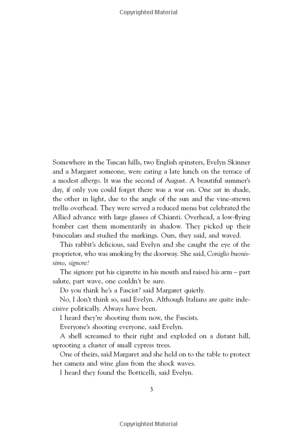 Ulysses Temper is a young British soldier, Evelyn Skinner a 64-year-old art historian living life on her own terms. She has come to salvage paintings from the wreckage of war and relive memories of her youth when her heart was stolen by an Italian maid in a particular room with a view. Ulysses’ chance encounter with Evelyn will transform his life – and all those who love him back home in London – forever.