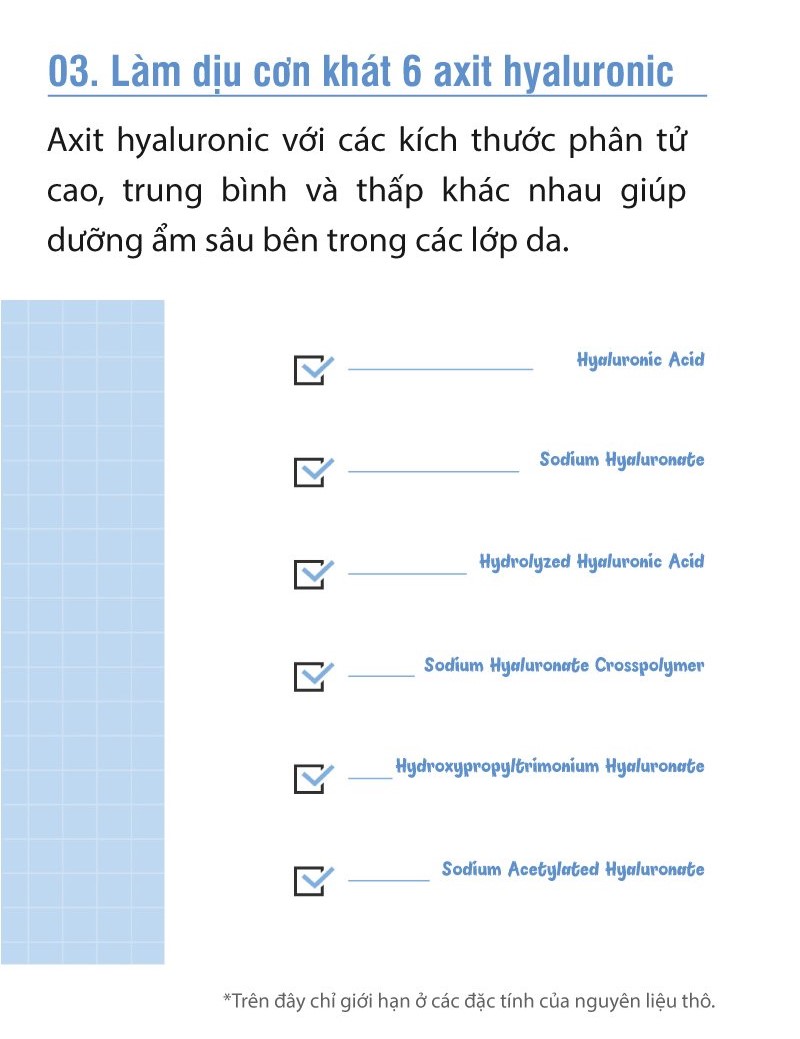 - 6 loại Hyaluronic Acid (HA): Hyaluronic Acid dưới các dạng phân tử khác nhau giúp cấp ẩm tận sâu các tế bào, giúp làn da luôn mịn màng, căng mọng.