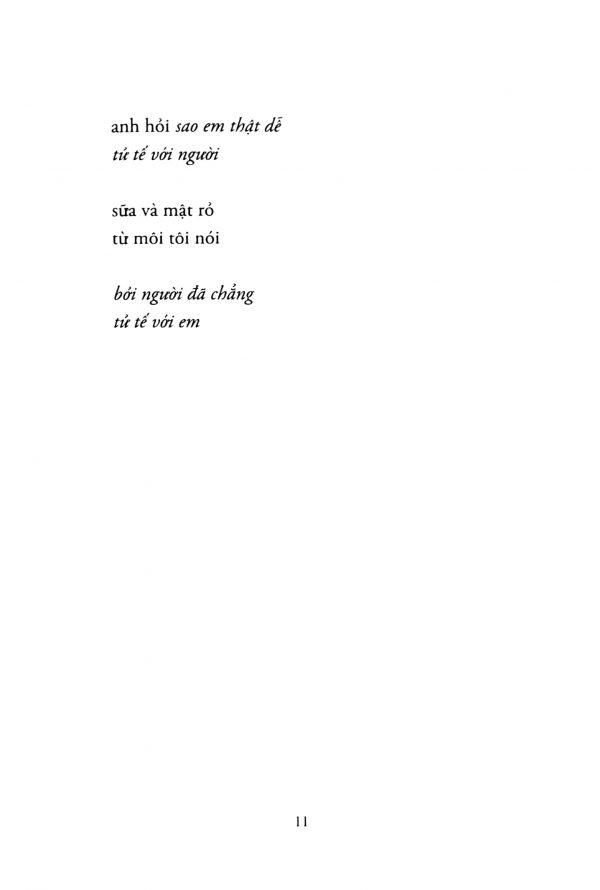 Những bài thơ và văn trong Sữa và mật nói với ta về chuyện sống còn, cùng những trải nghiệm về bạo lực, về lạm dụng, về yêu đương, về mất mát, và trên hết, về nữ tính không ngừng rạng ngời. Sữa và mật là một chuyến viễn du xuyên qua những thời khắc đau khổ, để tìm thấy ở đó cả sữa lẫn mật ngọt, trong thân phận người nữ.