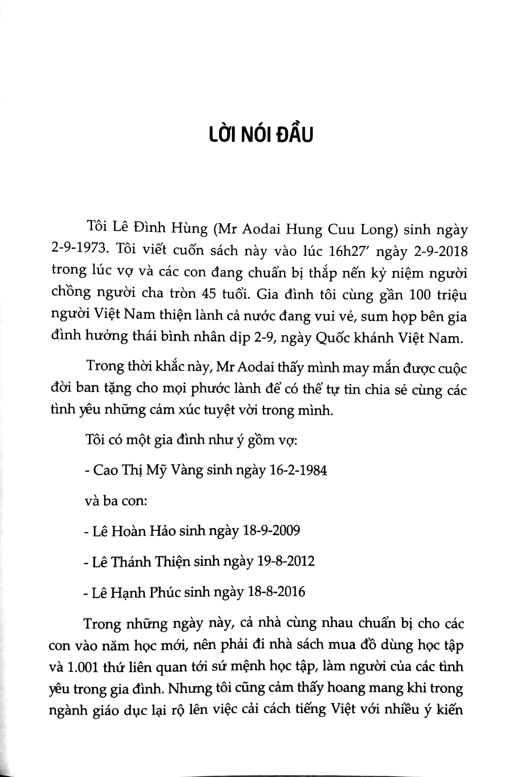 Tôi Lê Đình Hùng (Mr Aodai Hung Cuu Long) sinh ngày 2-9-1973. Tôi viết cuốn sách này vào lúc 16h27’ ngày 2-9-2018 trong lúc vợ và các con đang chuẩn bị thắp nến kỷ niệm người chồng người cha tròn 45 tuổi. Gia đình tôi cùng gần 100 triệu người Việt Nam thiện lành cả nước đang vui vẻ, sum họp bên gia đình hưởng thái bình nhân dịp 2-9, ngày Quốc khánh Việt Nam.