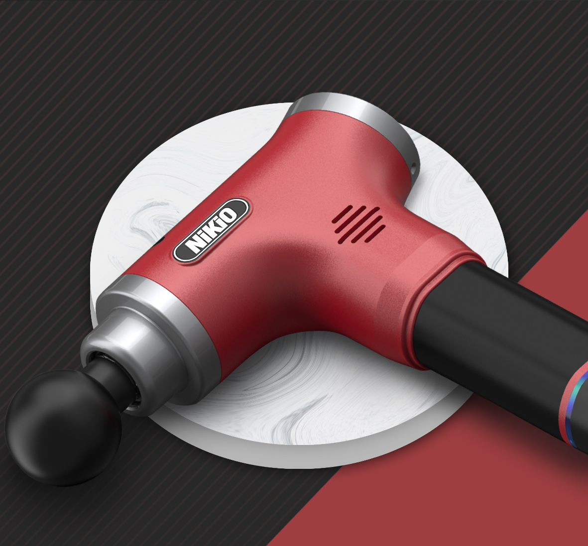 Súng massage gun cầm tay 4 đầu, 6 tốc độ Nhật Bản Nikio NK-170A - Màu đỏ đô - Đánh bay mọi cơn đau nhức mỏi, căng cơ hiệu quả Súng massage gun cầm tay