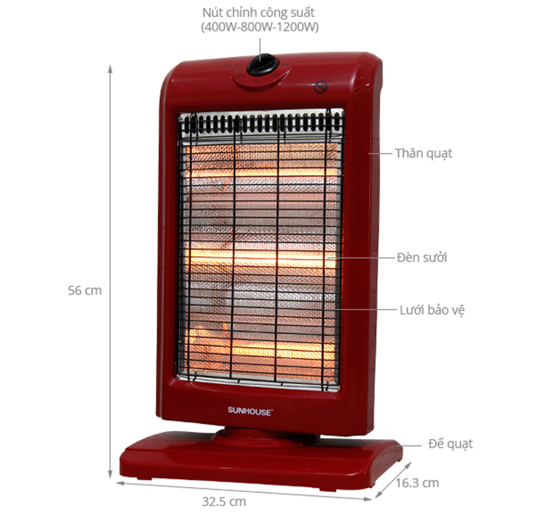 Tổng quan sản phẩm Sưởi Điện 3 Bóng Halogen Sunhouse Shd7016 (1000W) - Đỏ Đen là một trong những thiết bị sưởi ấm không thể thiếu tại gia đình trong mùa đông, Sản phẩm sử dụng đèn hồng ngoại siêu bền, tỏa nhiệt đều, không gây khó thở và khô da, đảm bảo an toàn cho người sử dụng, Kiểu dáng sang trọng, hiện đại Sưởi điện 3 bóng halogen SUNHOUSE SHD7016 có thiết kế sang trọng hơn, kiểu dáng hiện đại và bắt mắt, nhỏ gọn tiết kiệm diện tích và phù hợp mọi không gian như phòng khách, phòng ngủ. Điều khiển dễ dàng bằng nút xoay Sưởi điện hồng ngoại SUNHOUSE SHD7016 có 3 mức công suất 400W, 800W, 1000W điều chỉnh bằng núm vặn linh hoạt theo 2 chiều giúp bạn dễ dàng lựa chọn được mức nhiệt phù hợp với môi trường và nhu cầu sử dụng. Chắc chắn, bền đẹp, an toàn SHD7016 có chân đế vững chãi, lưới bảo vệ, tránh gây bỏng cho người dùng, Đặc biệt, lồng và vỏ nhựa phía sau chống cháy tuyệt đối, lưới tản nhiệt giúp sản phẩm không bị hư hỏng do quá nóng. Làm ấm cực nhanh, không gây khô da SUNHOUSE SHD7016 sử dụng đèn hồng ngoại, làm ấm cực nhanh, độ bền vượt trội, chống chói mắt hiệu quả và không đốt cháy oxy nên không gây khó thở hay khô da khi dùng. Quay đảo chiều, tỏa nhiệt đều khắp phòng Sản phẩm có khả năng quay đảo chiều liên tục, giúp tỏa nhiệt đều khắp phòng, rất thích hợp khi sử dụng tại không gian rộng như phòng khách hoặc phòng có nhiều người. An toàn với người sử dụng Sưởi điện hồng ngoại SUNHOUSE SHD7016 có chế độ tự động ngắt điện khi bị nghiêng đổ và hoạt động trở lại bình thường trở lại trạng thái an toàn.