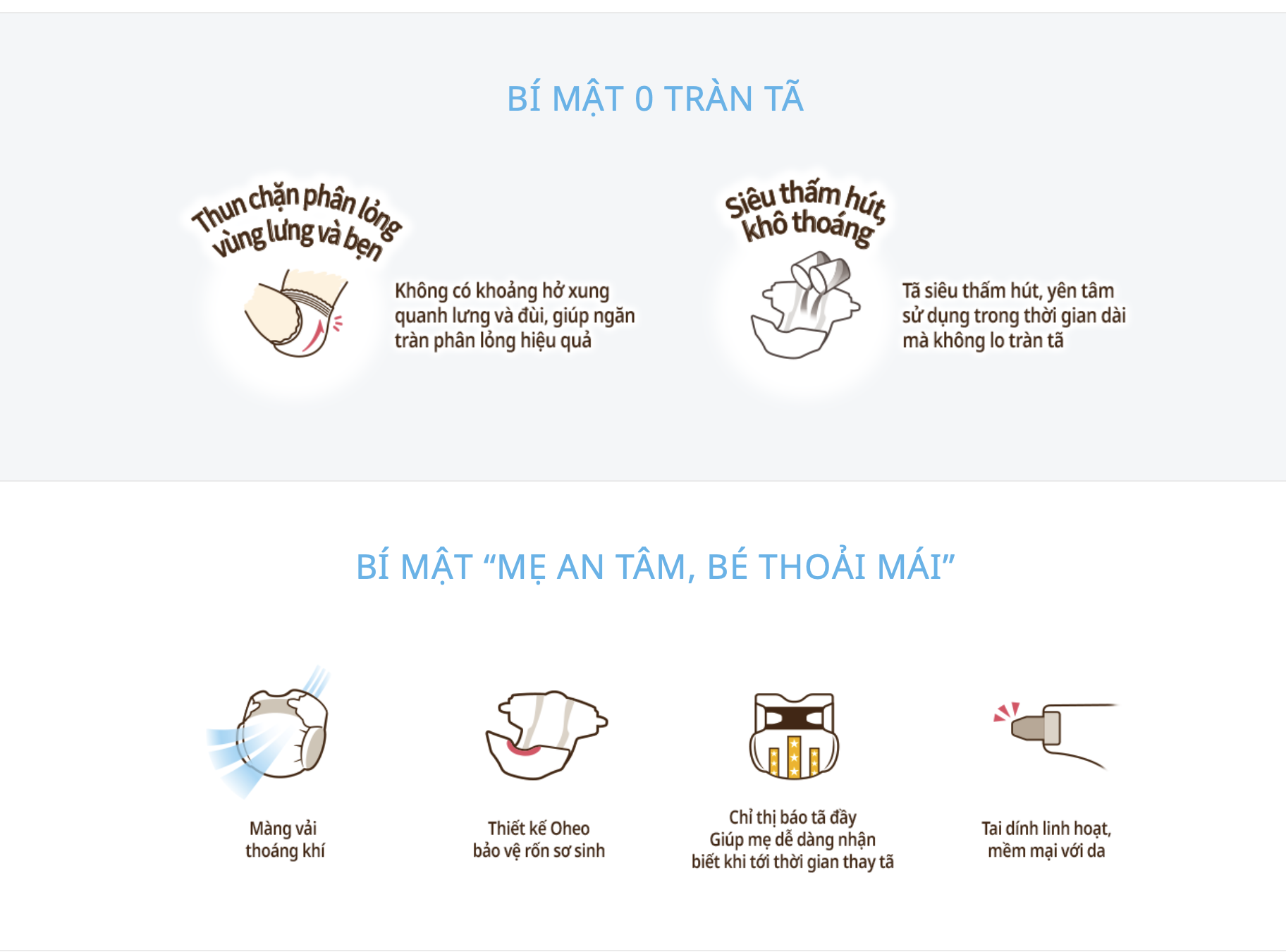 - Bề mặt tã mềm mịn, bổ sung 3 loại tinh dầu thiên nhiên: Dầu Olive, dầu Jojoba, dầu Gạo có tác dụng chăm sóc da, kháng viêm, ngăn ngừa hăm tã.