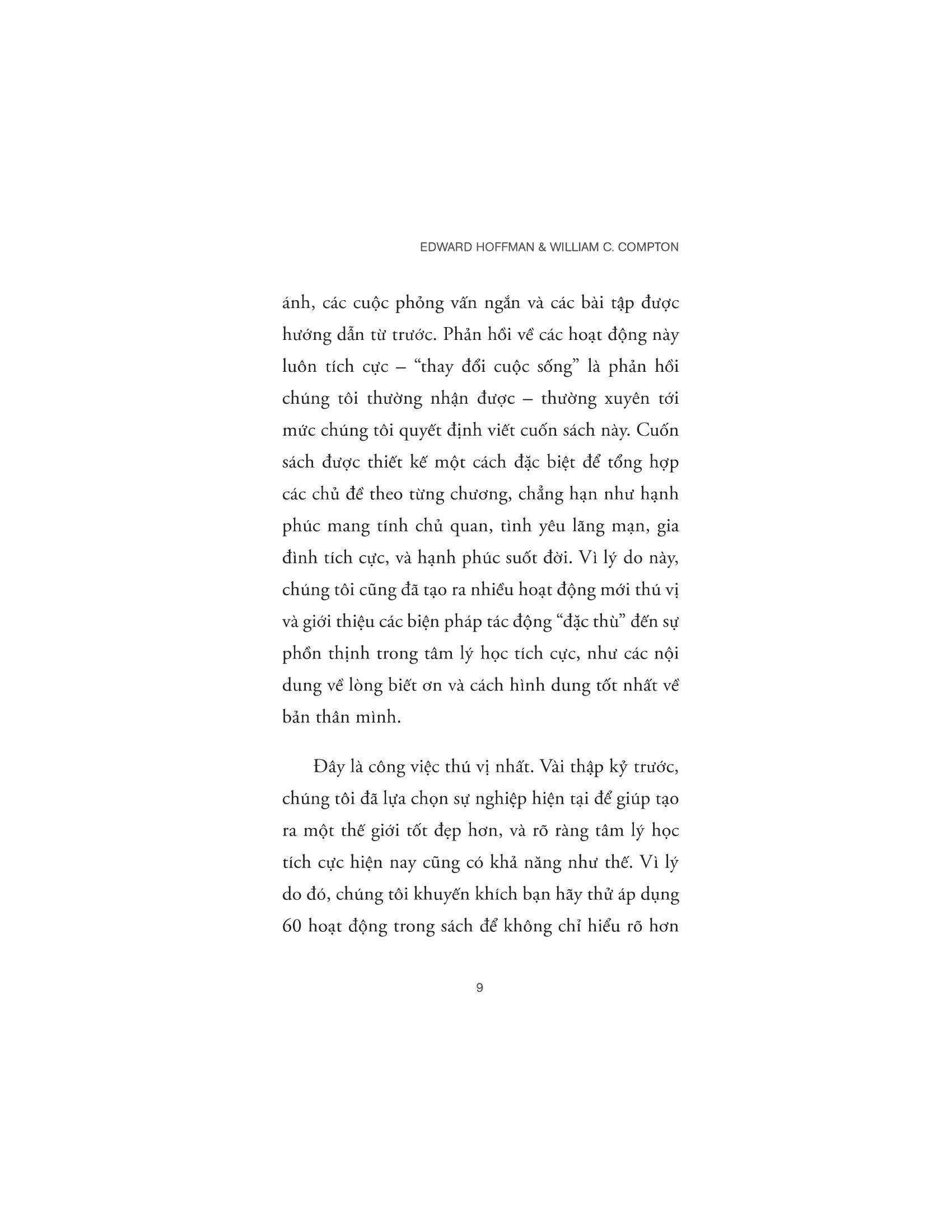 “Tâm lý học tích cực” là một cuốn sách thực hành về sự phát triển cá nhân và nuôi dưỡng niềm vui. Cuốn sách bao gồm 60 nội dung độc lập và súc tích để giúp người đọc tối ưu hóa sự phát triển cá nhân, nhằm làm chủ một cuộc sống hạnh phúc hơn, trọn vẹn hơn và có ý nghĩa hơn.