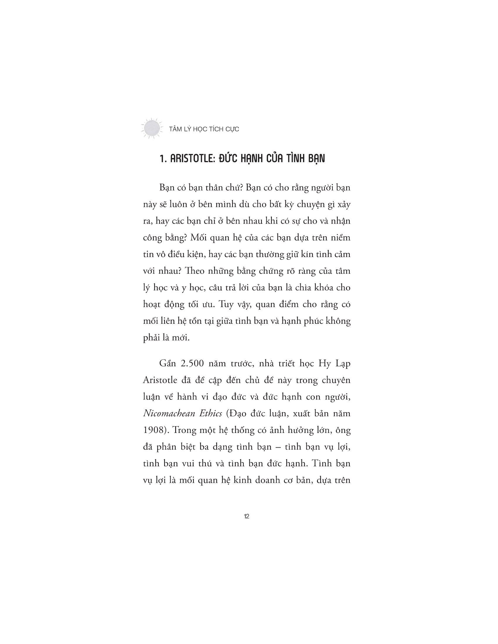 Đây là một cuốn sách triển khai thực hành dựa trên những nghiên cứu khoa học đã được kiểm chứng và tích lũy qua nhiều năm, “Tâm lý học tích cực” chính là nguồn tham khảo hữu ích nhất đối với bất cứ ai muốn nói không với trì hoãn, để tập trung ý chí cho một bản thân tốt đẹp và hoàn thiện hơn, và thực sự thay đổi chính m.ình ngay từ hôm nay.