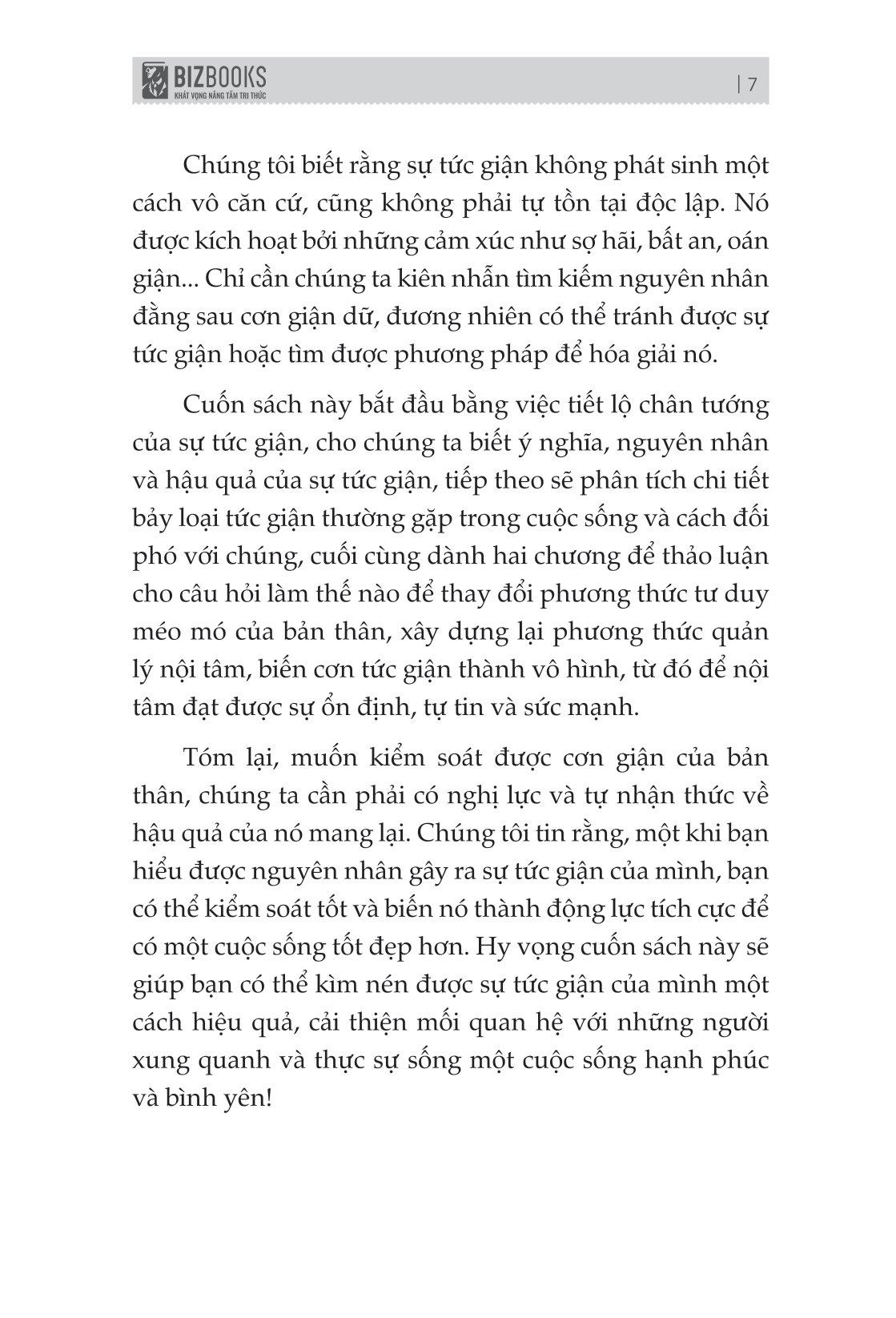 Muốn kiểm soát được cơn giận của bản thân, chúng ta cần phải có nghị lực và tự nhận thức về hậu quả của nó mang lại. Một khi bạn hiểu được nguyên nhân gây ra sự tức giận của m.ình, bạn sẽ có thể kiểm soát tốt nhất và biến nó thành động lực tích cực để có một cuộc sống tốt đẹp hơn. Hy vọng cuốn sách này sẽ giúp bạn có thể kìm nén được sự tức giận của m.ình một cách hiệu quả, cải thiện mối quan hệ với những người xung quanh và thực sự sống một cuộc sống hạnh phúc và bình yên,