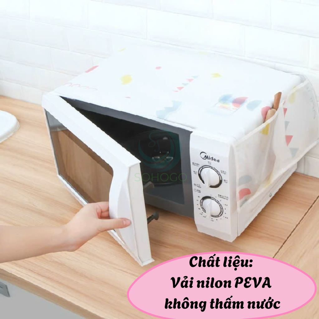 Áo trùm lò vi sóng. Áo phủ lò vi sóng bao trùm được toàn bộ lò vi sóng, phía bên hông còn có ngăn để đựng các dụng cụ nhà bếp gọn gàng, giúp bạn