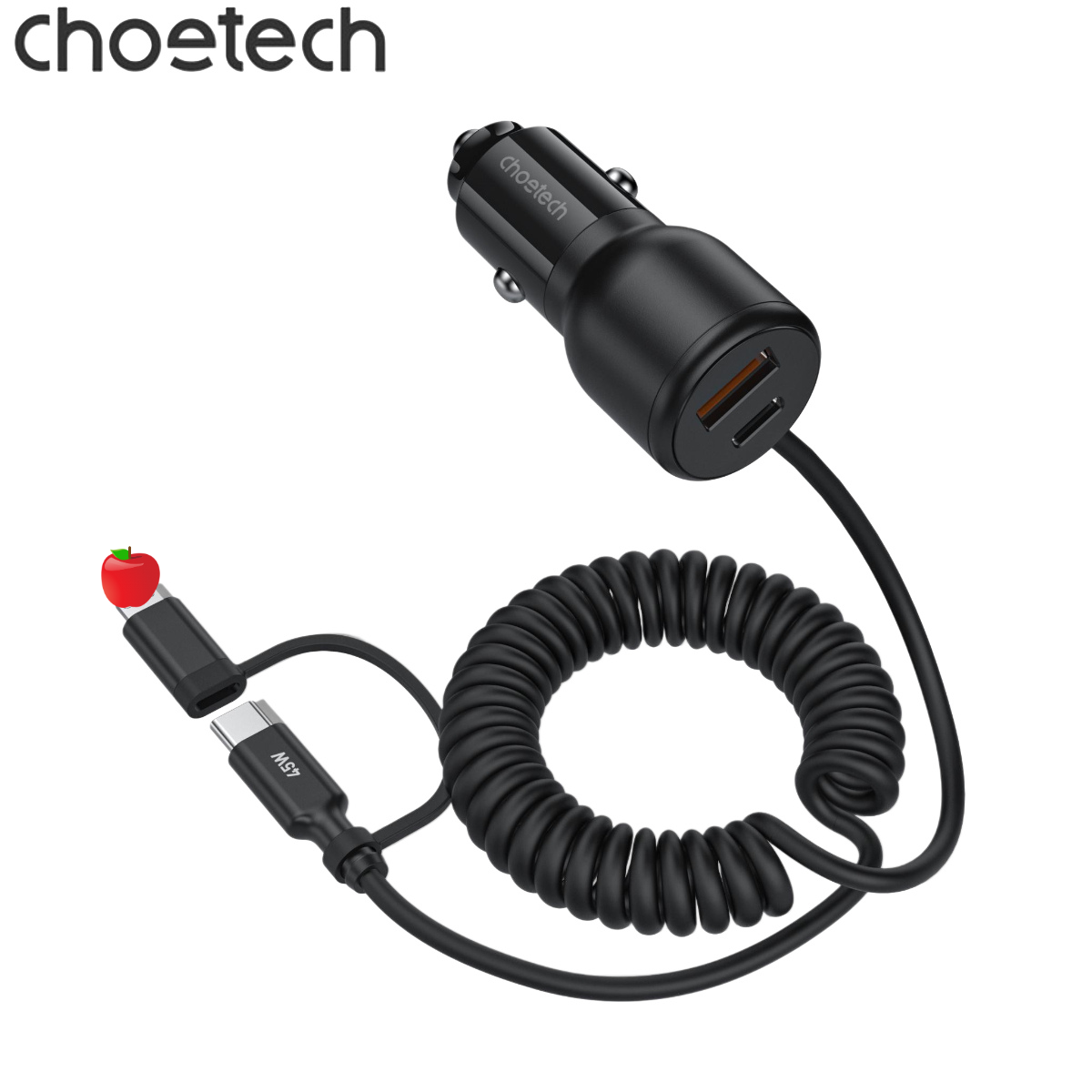 ✨Tẩu sạc nhanh 2 cổng trên ô tô 110W Choetech TC0038 tích hợp cáp lò xo Type C kèm đầu nối IP dài 1.5M (Hàng chính hãng)