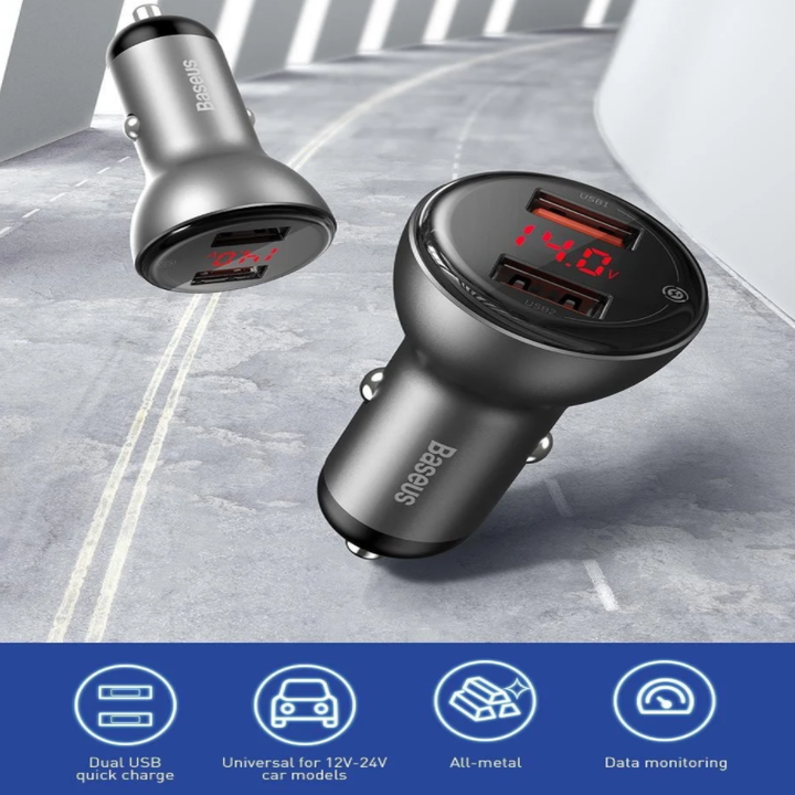 Tẩu sạc nhanh đa năng Baseus TZCCBX-B0G - Sản phẩm có thiết kế hiện đại với 2 cổng sạc USB và còn được trang bị đồng hồ LED báo thông số dòng điện, điện