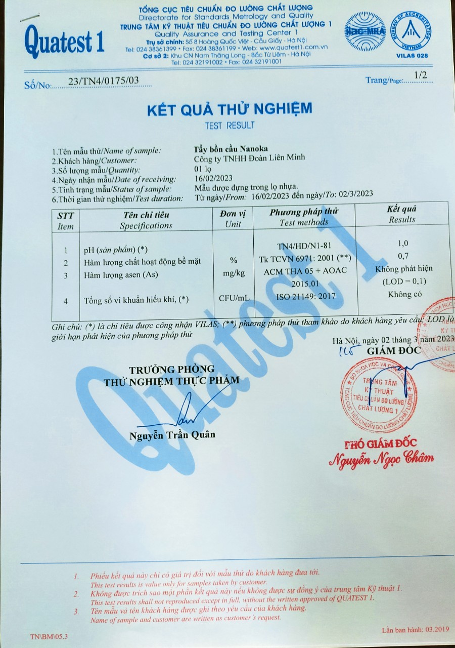 Tẩy bồn cầu Nanoka với tính năng phan hủy nhanh vết ố vàng, cặn bám chắc lâu ngày tại các mép, bề mặt gạch nhà vệ sinh, những chỗ khuất của bồn cầu, đánh bay dễ dàng và nhanh chóng, trả lại vẻ sáng sạch an toàn cho toilet nhà bạn, đẩy xa vi khuẩn gây hại, hạn chế cặn gây ố trở lại, giảm thiểu số lần phải cọ rửa, lau chùi vất vả, giúp tiết kiệm tiền và thời gian đáng kể cho bạn. Tên sản phẩm: Tẩy bồn cầu Nanoka Thương hiệu: Nanoka Thành phần: Nước, NaOH, country, and other components Hướng dẫn sử dụng: - Sử dụng kính, khẩu trang, găng tay cao su khi tẩy rửa và sử dụng sản phẩm. - Đổ hoặc xịt trực tiếp Tẩy bồn cầu Nanoka vào những chỗ ố vàng, cặn bẩn. - Sử dụng công cụ tẩy rửa, chà cọ bề mặt và những chỗ cong khuất khó tiếp cận. Đánh bay và dội sạch sẽ bằng nước. - Nên sử dụng thường xuyên. Hạn chế sử dụng nhà vệ sinh trong lúc đang tẩy rửa, rửa sạch sẽ các vật dụng trước khi dùng. Lưu ý: - Tránh xa tầm tay trẻ em. - Không được uống. - Tránh tiếp xúc trực tiếp với mắt. TCCS: TCCS 312022/NANOKA Dung tích: 5kg Sản xuất tại Việt Nam Website: Kar-d.com - Địa chỉ: 26 TT9 Đường Foresa8 - Khu đô thị