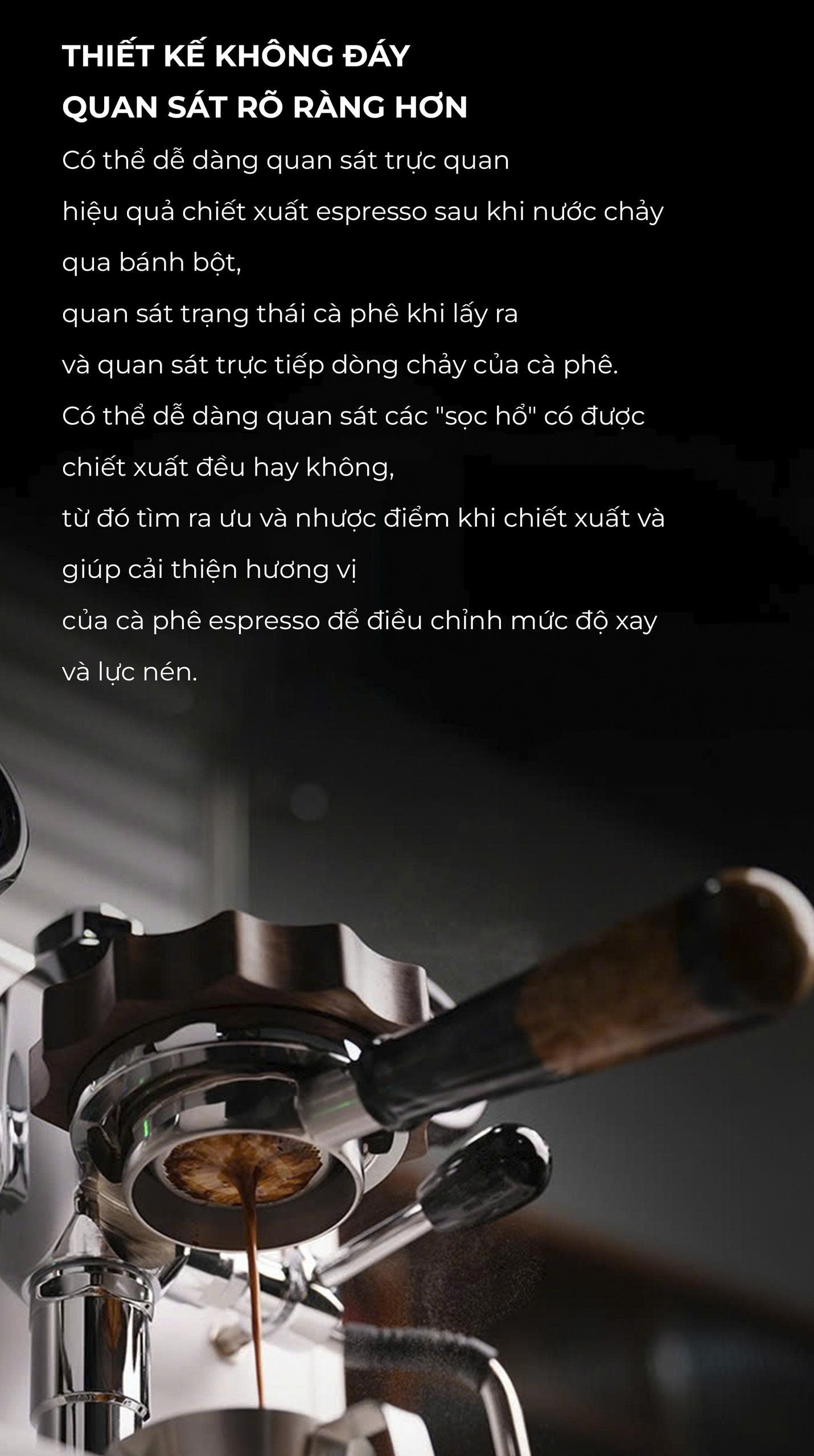 Đặc biệt, tay cầm này sở hữu thiết kế không đáy, giúp bạn quan sát rõ ràng quá trình chiết xuất cà phê trong suốt. Điều này giúp bạn kiểm soát chất lượng espresso một cách tối ưu, đảm bảo mỗi lần pha chế đều đạt được độ sánh mịn, đậm đà như ý.