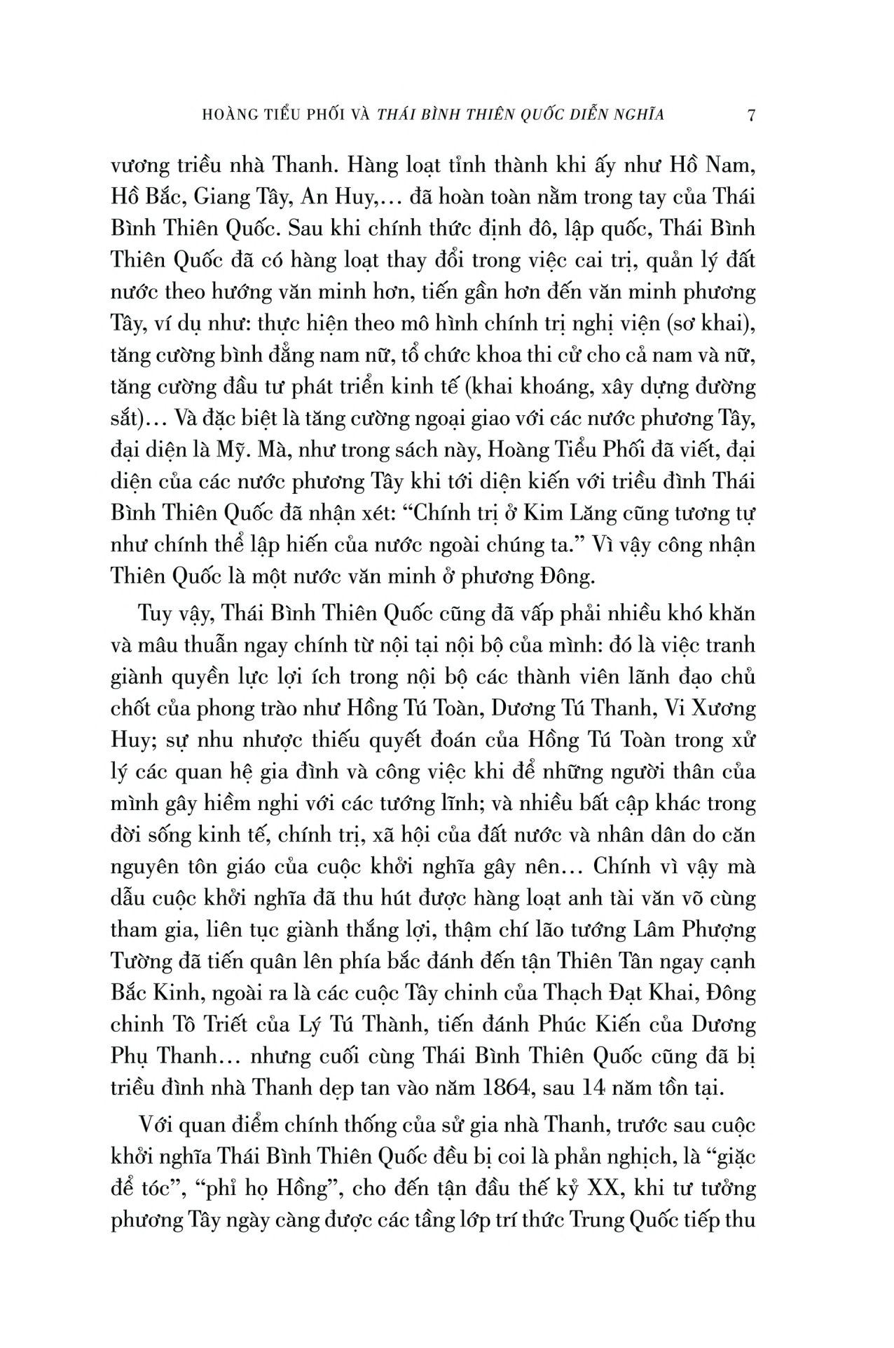 Qua 54 hồi của tiểu thuyết Thái Bình Thiên Quốc diễn nghĩa viết theo lối chương hồi cổ điển, Hoàng Tiểu Phối đã dẫn dắt người đọc lần lượt đi theo từng bước phát triển 14 năm của phong trào Thái Bình Thiên Quốc (1851 - 1864), qua từng trận đánh oanh liệt đẫm máu, với những con số thương vong ở mỗi trận chiến khiến độc giả phải kinh tâm động phách. Cùng với đó, mỗi nhân vật với tính cách, số phận khác nhau cũng được ông mô tả và kể lại một cách sống động và đầy màu sắc. Là một người sống cách chưa xa thời gian mà cuộc khởi nghĩa nổ ra, lại được gặp gỡ hỏi han những người trực tiếp tham gia phong trào ấy, rõ ràng Hoàng Tiểu Phối cho chúng ta thấy được độ tin cậy và chính xác nhất định của câu chuyện Thái Bình Thiên Quốc.