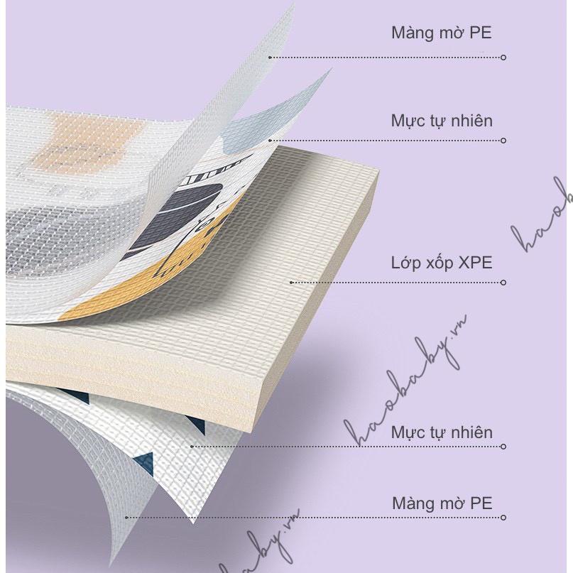 - Kích thước 1m4x1m8x1.5 cm. Ưu điểm Phải nói là dòng thảm tuyệt vời dành cho các Bé mà 100% các Mẹ nhận hàng và sử dụng đều hài lòng về chất lượng Chống thấm nước nên 2 vợ chồng nhàn hẳn ra, Bé có lỡ vệ sinh ra thảm chỉ cần dùng khăn lau là sạch luôn ý. Thảm có độ mềm,êm và đàn hồi vượt trội, cực an toàn khi bé vận dộng, vui chơi trên thảm. Độ bền cực cao gấp 5 lần thảm xốp thông thường. Không mùi (cả trước và sau khi sử dụng),không có mùi nhựa,mùi xốp như các chất liệu rẻ tiền khác). Không chứa thành phần độc hại đáp ứng tiêu chuẩn đảm bảo sử dụng an toàn cho trẻ sơ sinh và trẻ nhỏ. Bề mặt thảm xốp có vân nổi chống trơn trượt. Thảm có 2 mặt với 2 hình khác nhau,thỉnh thoảng thay đổi cho mới. Thảm có hình thù họa tiết màu sắc đáng yêu bé sẽ vô cùng thích thú. Có thể gấp gọn mang đi khắp mọi nơi,cất gọn không tốn diện tích luôn ạ. Chất liệu Chất liệu xốp XPE không mùi. An toàn tuyệt đối.