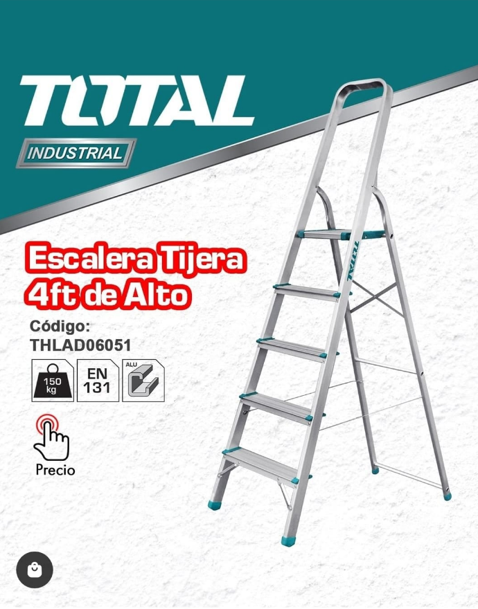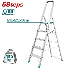 Thông số kĩ thuật -Mã sản phẩm: THLAD06051 -Nhà sản xuất: Total -Chất liệu bằng nhôm, có 5 bậc thang -Khoảng cách giữa hai bậc thang: 219mm -Khoảng cách giữa bậc trên cùng và tay cầm: 611mm -Khoảng cách từ mặt đất đến bậc trên cùng: 1097mm -Kích thước của bậc trên cùng: 260x250x30mm. Sức tải: 150kg