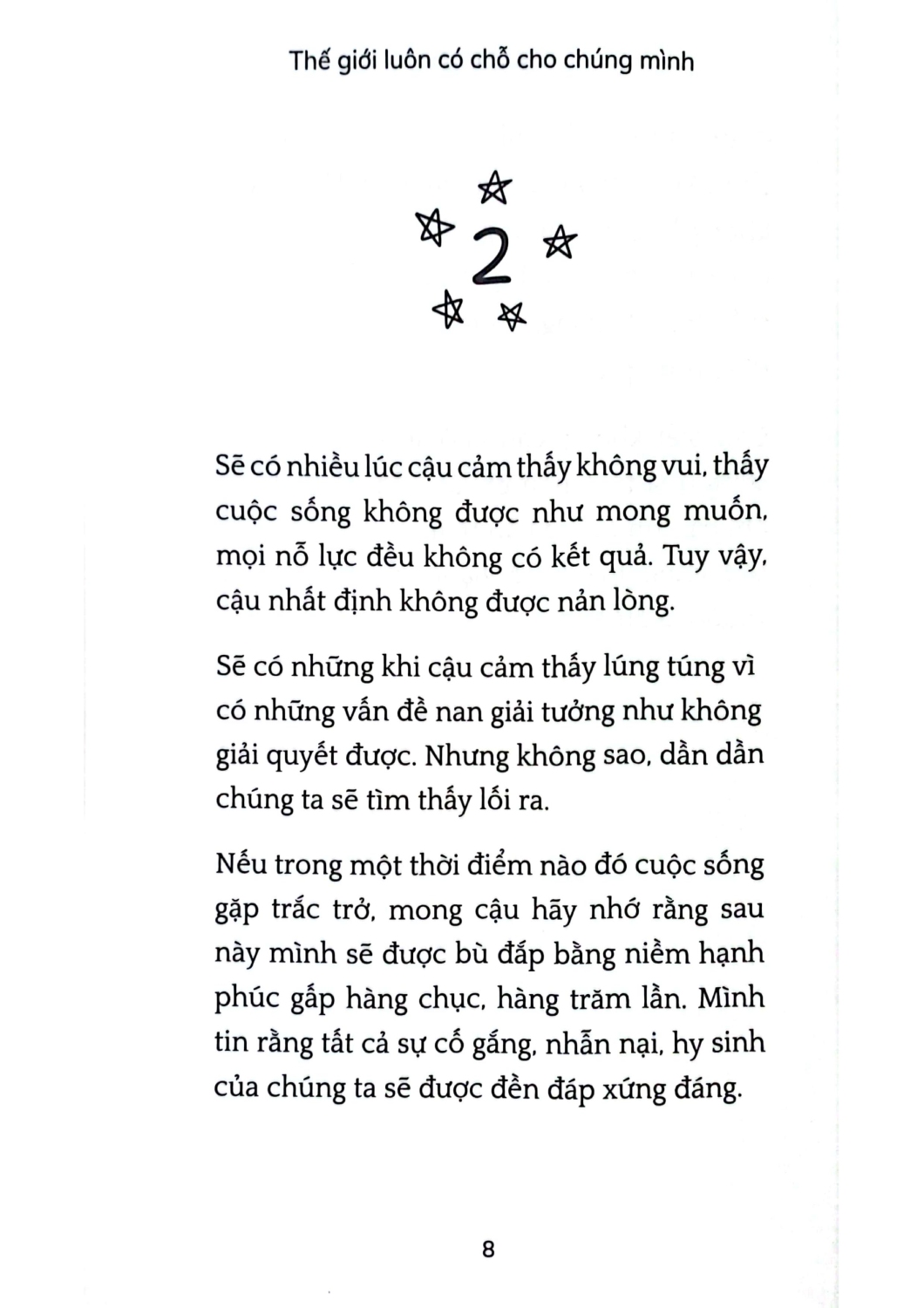 Thế Giới Luôn Có Chỗ Cho Chúng Mình NỘI DUNG SÁCH: Bạn đã bao giờ cảm thấy thế này chưa? Đôi lúc thấy thế giới thật rộng lớn, đi hoài đi mãi vẫn không tìm được một nơi mình thực sự “thuộc về”. Nhưng lắm lúc lại thấy mảnh đất này thật chật chội, dù đi đến đâu cũng không bỏ lại được những tổn thương. Dường như chúng mình đều là lần đầu tiên đến với thế giới này, lần đầu học cách làm người lớn, lần đầu đối diện với những nỗi đau và học cách đứng lên. Chúng ta đều sẽ mắc sai lầm, nhưng rồi tất cả đều sẽ vượt qua. Thế giới lúc rộng, lúc hẹp, lúc đẹp đẽ, lúc xấu xí… nhưng thế giới luôn có chỗ cho chúng mình. Thế Giới Luôn Có Chỗ Cho Chúng Mình là cuốn sách đầu tay của cô gái nhỏ embedanglon. Mang trong mình một trái tim nhạy cảm, một tình yêu to lớn với cuộc sống, tác giả embedanglon dùng những câu văn dịu dàng nhất để vỗ về những tâm hồn non nớt đang tập làm người lớn. Bạn biết không, bạn không cần thiết phải sống dựa trên tiêu chuẩn của người khác, chỉ cần tin tưởng bản thân, sống một cuộc đời khỏe mạnh và hạnh phúc như bạn muốn là được rồi. Trong đời mỗi người đều có rất nhiều chặng đường phải vượt qua, có một con đường không thể quay lại mang tên thời gian, có một con đường không thể từ chối mang tên trưởng thành. Chắc hẳn để đi được đến đây, bạn cũng đã rất vất vả rồi! Bạn luôn mỉm cười với từng người mình gặp gỡ. Bạn biết quý trọng những gì mình đang có trong tay. Cảm ơn bạn thật nhiều vì đã là một đứa trẻ ngoan, dù trong tim từng có những tổn thương nhưng vẫn mạnh mẽ trưởng thành, vẫn yêu đời và yêu người đến vậy!