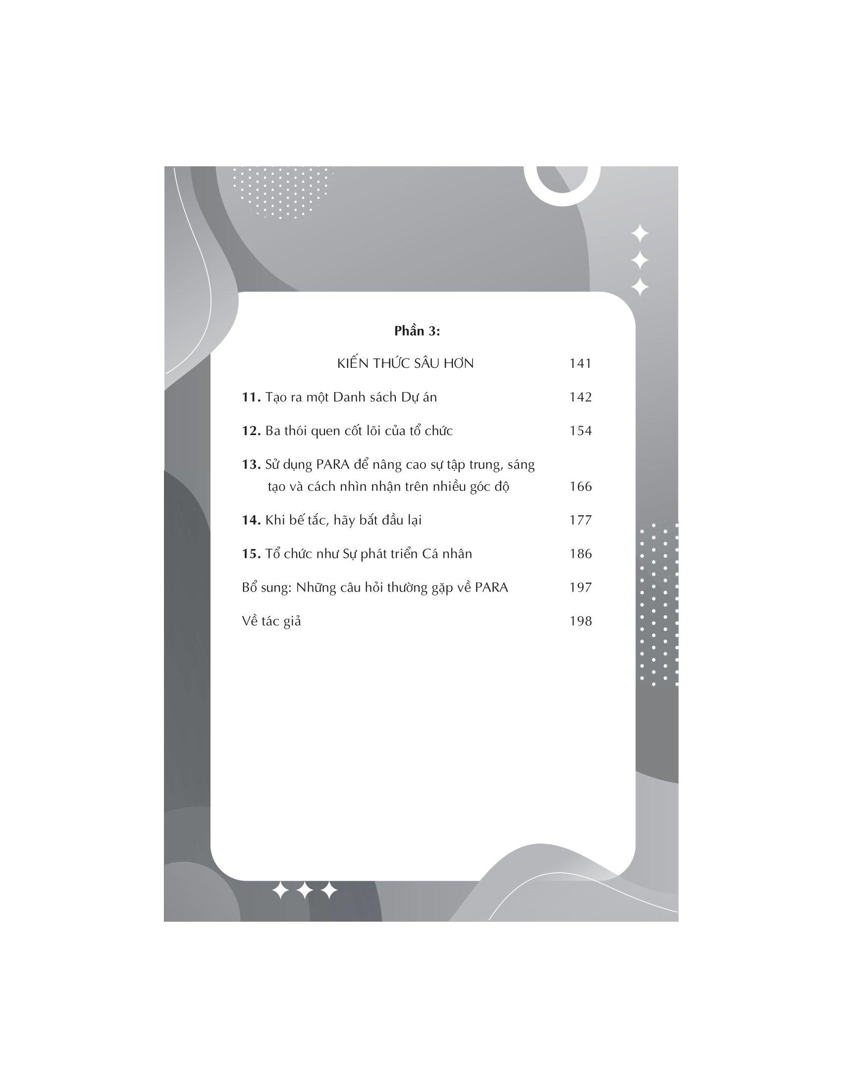 • A (Archives) Lưu trữ: Đây là nơi chúng ta đặt những mục không còn hoạt động (các dự án đã hoàn thành, lĩnh vực không còn quan tâm, nguồn tài nguyên không còn sử dụng thường xuyên) Với cách viết dễ hiểu và hấp dẫn, tác giả Tiago Forte phác thảo các phương pháp hay nhất và mẹo về cách triển khai PARA thành công, cùng với việc tìm hiểu sâu về mọi thứ, từ cách áp dụng thói quen để luôn ngăn nắp cho đến cách sử dụng hệ thống này để nâng cao sự tập trung của bạn. Phương pháp PARA có thể được triển khai chỉ trong vài giây nhưng có khả năng biến đổi quỹ đạo công việc và cuộc sống của bạn bằng cách sử dụng sức mạnh của tổ chức kỹ thuật số. Về tác giả: TIAGO FORTE là một trong những chuyên gia hiệu suất hàng đầu trên thế giới, đã giảng dạy cho hàng nghìn người về các nguyên tắc thời gian và công nghệ tiên tiến nhất có thể cách mạng hóa năng suất, sự sáng tạo và hiệu quả cá nhân. Ông đã từng làm việc với nhiều tổ chức như Genentech, Tập đoàn Toyota Motor và Ngân hàng Phát triển Inter-American. Ông xuất hiện trên nhiều ấn phẩm như New York Times, The Atlantic và Harvard Business Review.