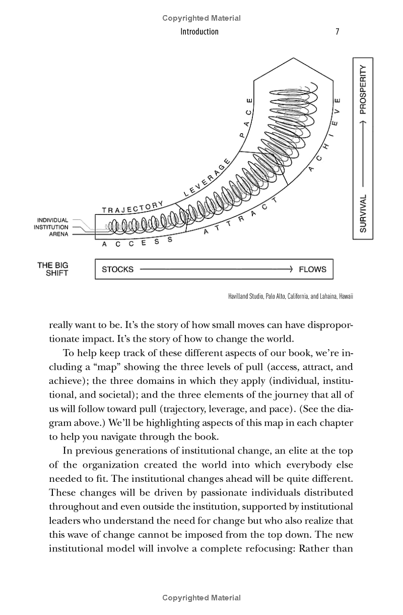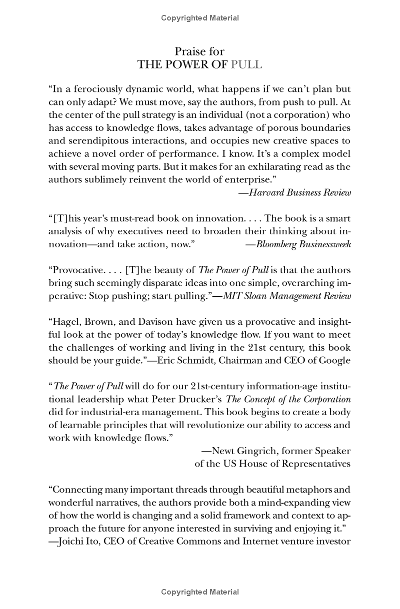In a radical break with the past, information now flows like water, and we must learn how to tap into its stream. Individuals and companies can no longer rely on the stocks of knowledge that they've carefully built up and stored away. Information now flows like water, and we must learn how to tap into the stream. But many of us remain stuck in old practices- practices that could undermine us as we search for success and meaning. In this revolutionary book, three doyens of the Internet age, whose path-breaking work has made headlines around the world, reveal the adjustments we must make if we take these changes seriously. In a world of increasing risk and opportunity, we must understand the importance of pull . Understood and used properly, the power of pull can draw out the best in people and institutions by connecting them in ways that increase understanding and effectiveness. Pull can turn uncertainty into opportunity, and enable small moves to achieve outsized impact. Drawing on pioneering research, The Power of Pull shows how to apply its principles to unlock the hidden potential of individuals and organizations, and how to use it as a force for social change and the development of creative talent. The authors explore how to use the power of pull to: Access new sources of information Attract likeminded individuals from around the world Shape serendipity to increase the likelihood of positive chance encounters Form creation spaces to drive you and your colleagues to new heights Transform your organization to adapt to the flow of knowledge The Power of Pull is essential reading for entrepreneurs, managers, and anybody interested in understanding and harnessing the shifting forces of our networked world.