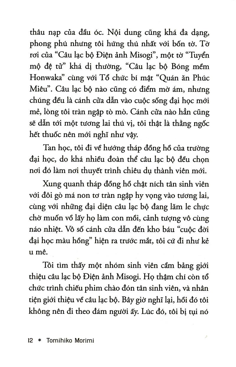 Với lối trần thuật vừa nghiêm túc vừa ngạo mạn nhưng thực tế lại giấu đầu lòi đuổi của “tôi”, các nhân vật trong truyện hiện ra đầy hấp dẫn. Từ thằng bạn Ozu như hiện thân của cái ác vô nghĩa lý cứ nhảy nhót liên tục quanh “tôi”; cô thiếu nữ tóc đen lạnh lùng với vẻ ngoài lý trí Akashi đã đâm thấu trái tim nam nhi của tôi; con người như tiên nhân luôn đưa ra những yêu cầu vô lý dành cho “tôi” là “sư phụ Higuchi”. Bị bao vây bởi những người như vậy, “tôi” lang thang khắp Kyoto, làm những điều vô nghĩa, mà người ngoài nhìn vào ai cũng sẽ chẳng nghi ngờ gì mà cho rằng đúng là một cuộc đời thường nhật vui vẻ không có ý nghĩa. Vậy nhưng, không hiểu vì lý do quái gì mà lại bất mãn như vậy, tôi luôn chạy trốn khỏi hiện thực lửng lơ trước mắt , mà mơ tưởng tới “cuộc đời đại học màu hồng” hẳn là có tồn tại kia.