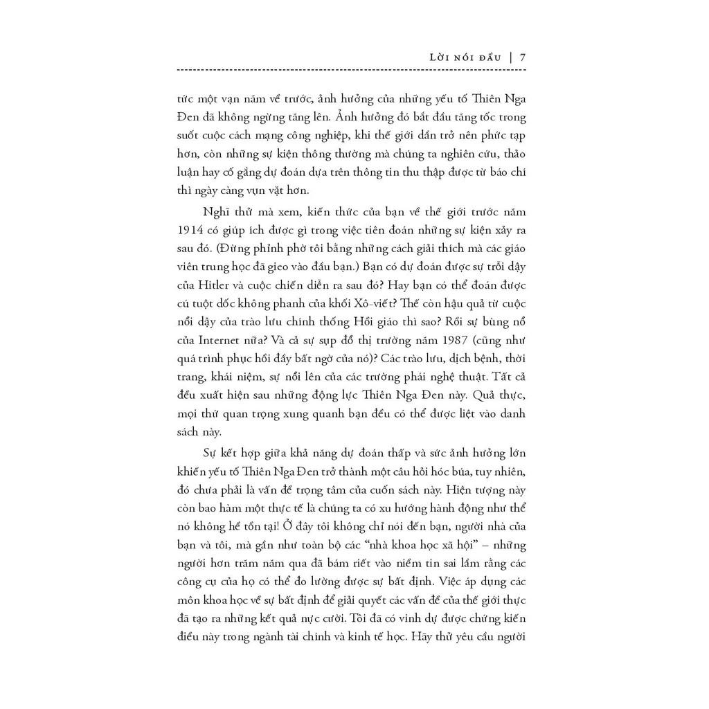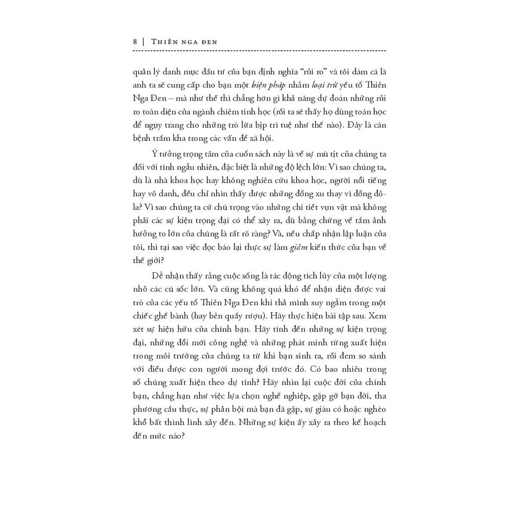 Chúng ta không biết rất nhiều thứ nhưng lại hành động như thể mình có khả năng dự đoán được mọi điều. Và trong cuốn sách này, tác giả Nassim Nicholas Taleb đã đi sâu vào khai thác những sai lầm của tư tưởng cố hữu ấy. Theo ông, “thiên nga đen” là một biến cố tưởng chừng như không thể xảy ra với ba đặc điểm chính: không thể dự đoán, có tác động nặng nề và sau khi nó xảy ra, người ta lại dựng lên một lời giải thích để khiến nó trở nên ít ngẫu nhiên hơn, dễ dự đoán hơn so với bản chất thật của nó. Thành công đáng kinh ngạc của Fb có thể được coi là một “thiên nga đen”, việc nước Anh rời khỏi Liên minh châu u cũng là một “thiên nga đen”. Thiên nga đen luôn ẩn hiện trong mọi mặt của cuộc sống với những tác động khó lường, theo cả hướng tiêu cực và tích cực.