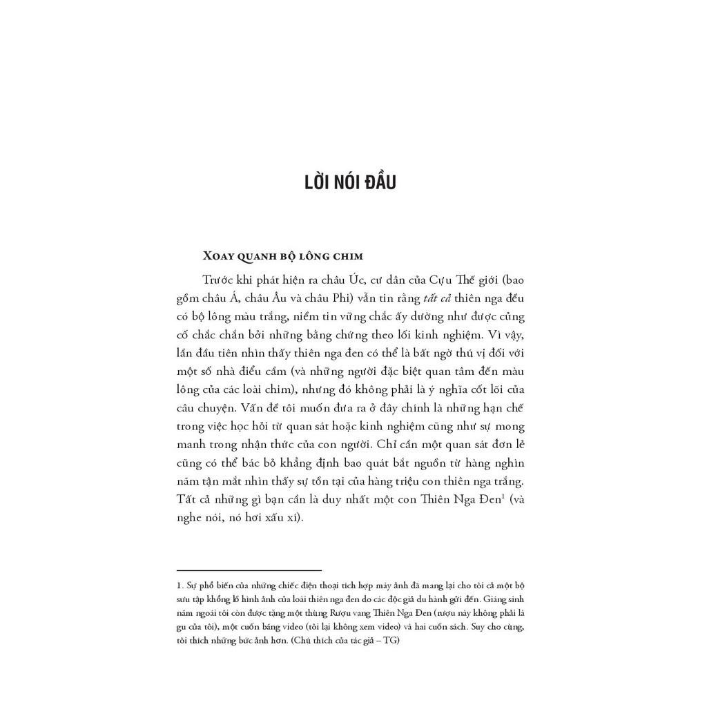Mua tại TiktokTrước khi khám phá ra thiên nga đen tồn tại trên đời (ở Úc), người ta vẫn tin rằng tất cả chim thiên nga trên đời đều có màu trắng. Phát hiện bất ngờ này đã thay đổi toàn bộ thế giới quan của nhân loại (về thiên nga). Chúng ta không biết rất nhiều thứ nhưng lại hành động như thể mình có khả năng dự đoán được mọi điều. Và trong cuốn sách này, tác giả Nassim Nicholas Taleb đã đi sâu vào khai thác những sai lầm của tư tưởng cố hữu ấy. Theo ông, “thiên nga đen” là một biến cố tưởng chừng như không thể xảy ra với ba đặc điểm chính: không thể dự đoán, có tác động nặng nề và sau khi nó xảy ra, người ta lại dựng lên một lời giải thích để khiến nó trở nên ít ngẫu nhiên hơn, dễ dự đoán hơn so với bản chất thật của nó. Thành công đáng kinh ngạc của Fb có thể được coi là một “thiên nga đen”, việc nước Anh rời khỏi Liên minh châu Âu cũng là một “thiên nga đen”. Thiên nga đen luôn ẩn hiện trong mọi mặt của cuộc sống với những tác động khó lường, theo cả hướng tiêu cực và tích cực. Tinh tế, táo bạo nhưng không kém phần thú vị, Thiên Nga Đen chắc chắn là cuốn sách không thể bỏ qua cho những ai đam mê hiểu biết. Và cuốn sách này, bản thân nó cũng chính là một thiên nga đen…