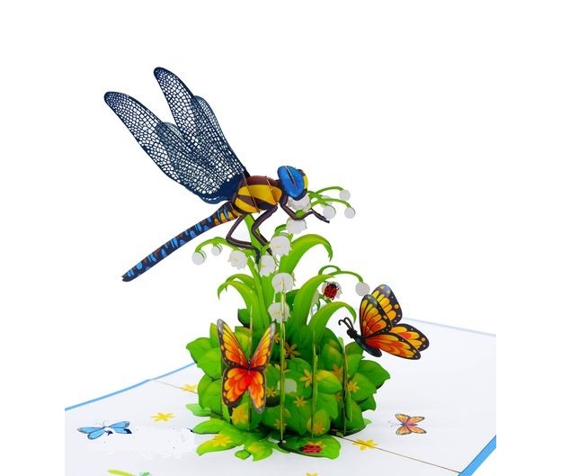 Mang đến sự bất ngờ đầy thú vị với thiệp 3D chuồn chuồn và bướm giữa vườn hoa. Khi mở ra, hình ảnh chuồn chuồn xanh cánh mảnh bay lượn bên hoa cùng những chú