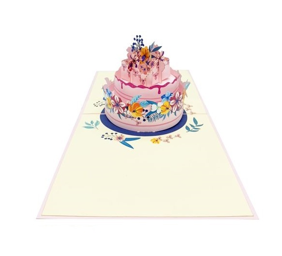 Mang đến sự bất ngờ và ấn tượng với thiệp 3D Pop Up bánh kem sinh nhật 3 tầng. Khi mở ra, chiếc bánh kem màu hồng trang trí hoa văn rực rỡ bật nổi