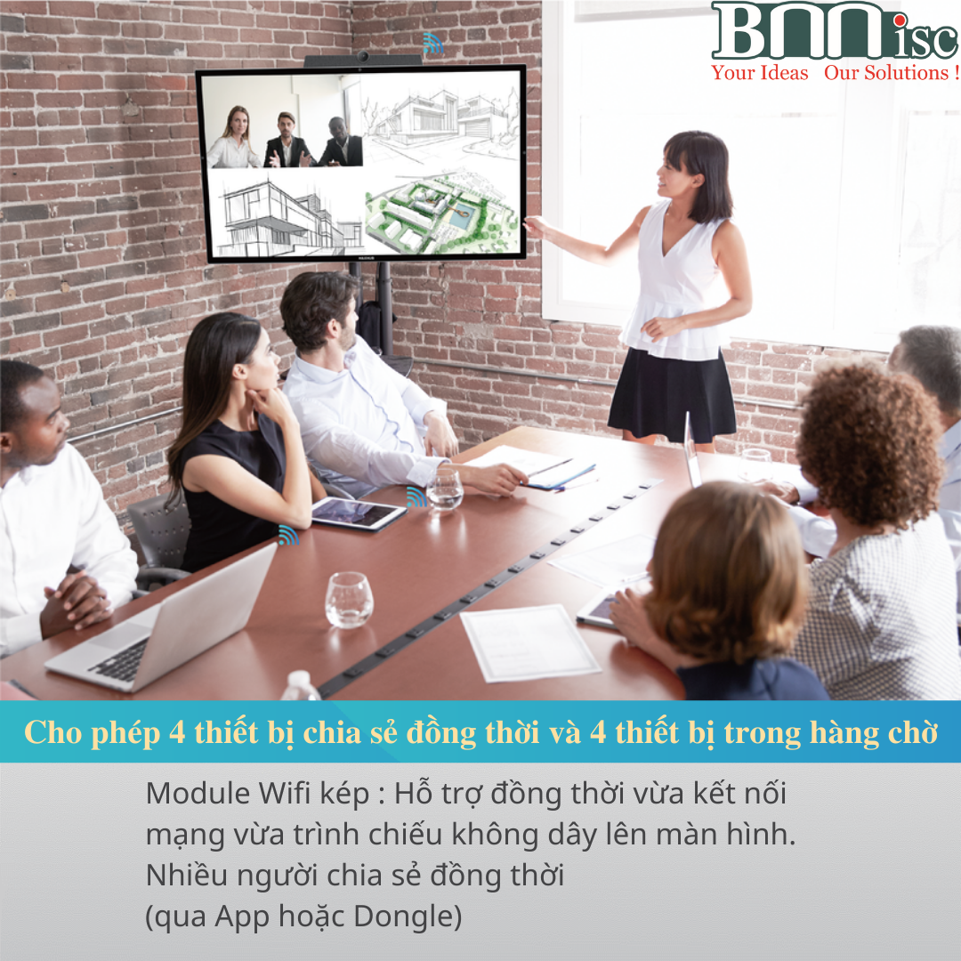 - Module Wifi kép : Hỗ trợ đồng thời kết nối mạng và trình chiếu không dây lên màn hình (Tivi/Projector),nhiều People chia sẻ đồng thời (qua App hoặc Dongle) (với chất lượng 4K cho 4 thiết bị đồng thời và 4 thiết bị trong hàng chờ).