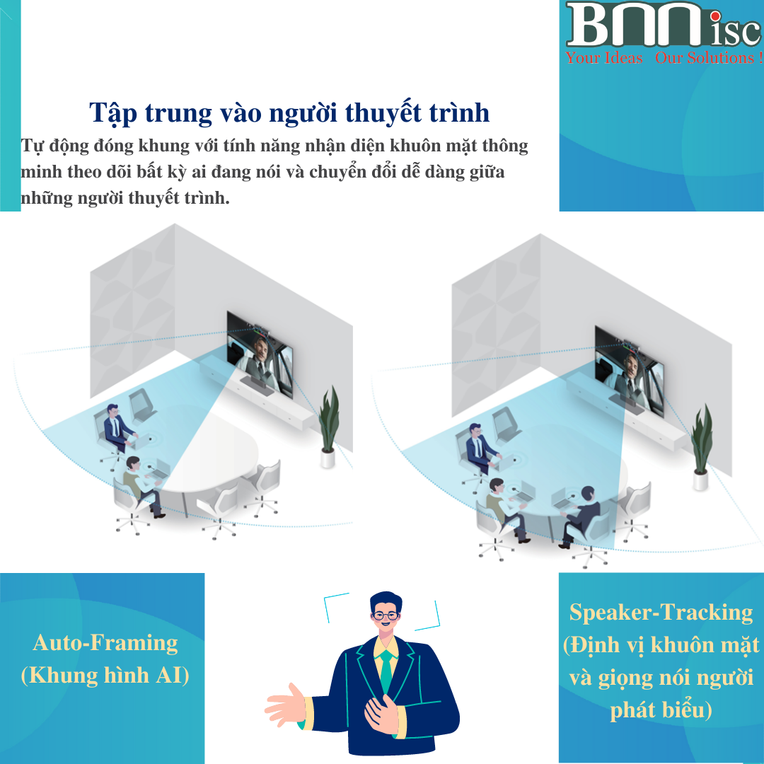 - Góc quay 120° , Lên/Xuống 15° , Tự động cân bằng sáng, giảm nhiễu, Tự động điều chỉnh bắt hình tất cả những People tham gia họp (Auto-Framing), Tự động bắt theo tiếng phát biểu.