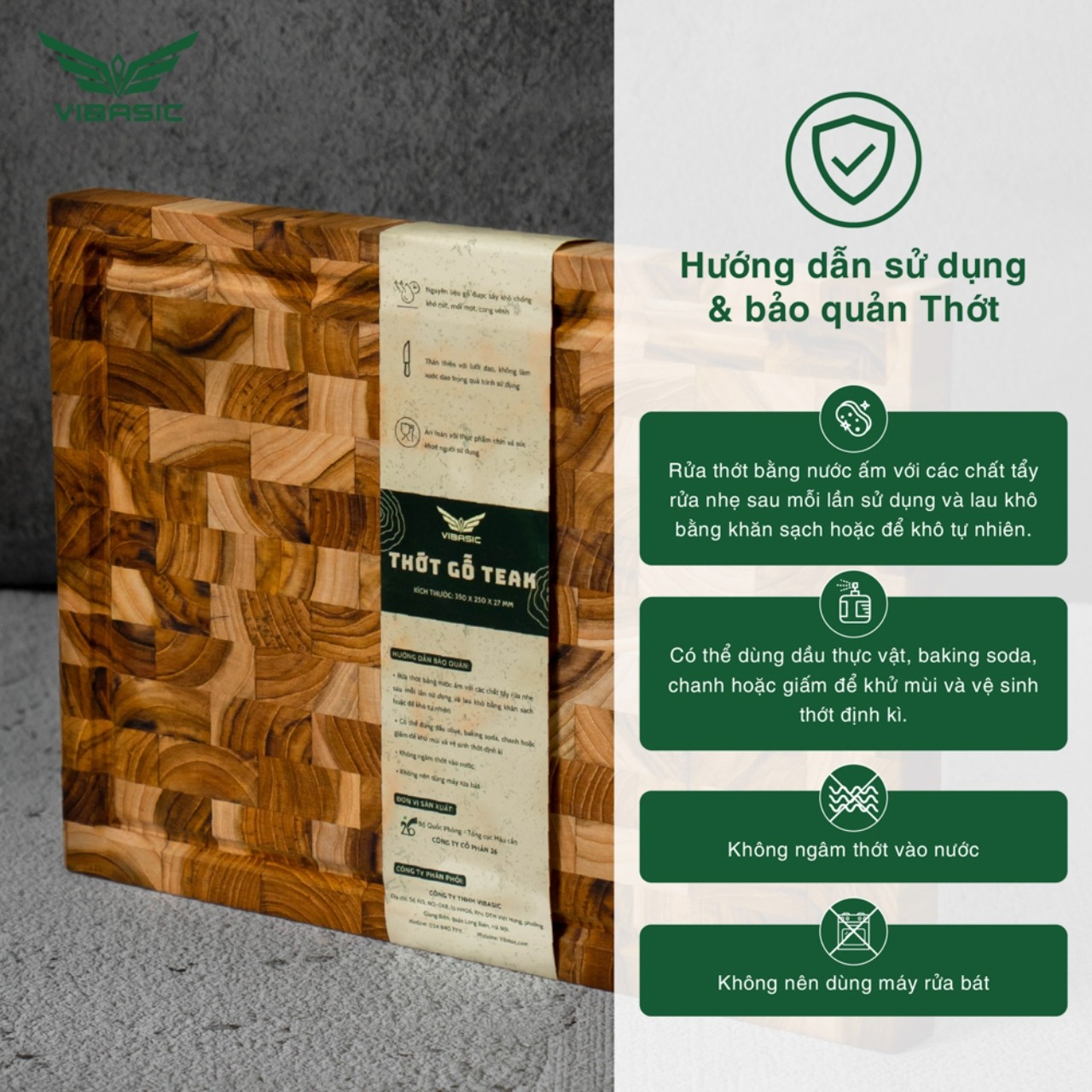 Thớt chặt gỗ Teak Vibasic Kích thước lý tưởng: 350x250x38mm, phù hợp cho việc cắt thái và băm chặt thực phẩm. Sản phẩm này được làm từ 100% gỗ Teak rừng trồng, mang lại độ