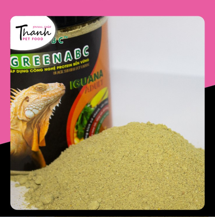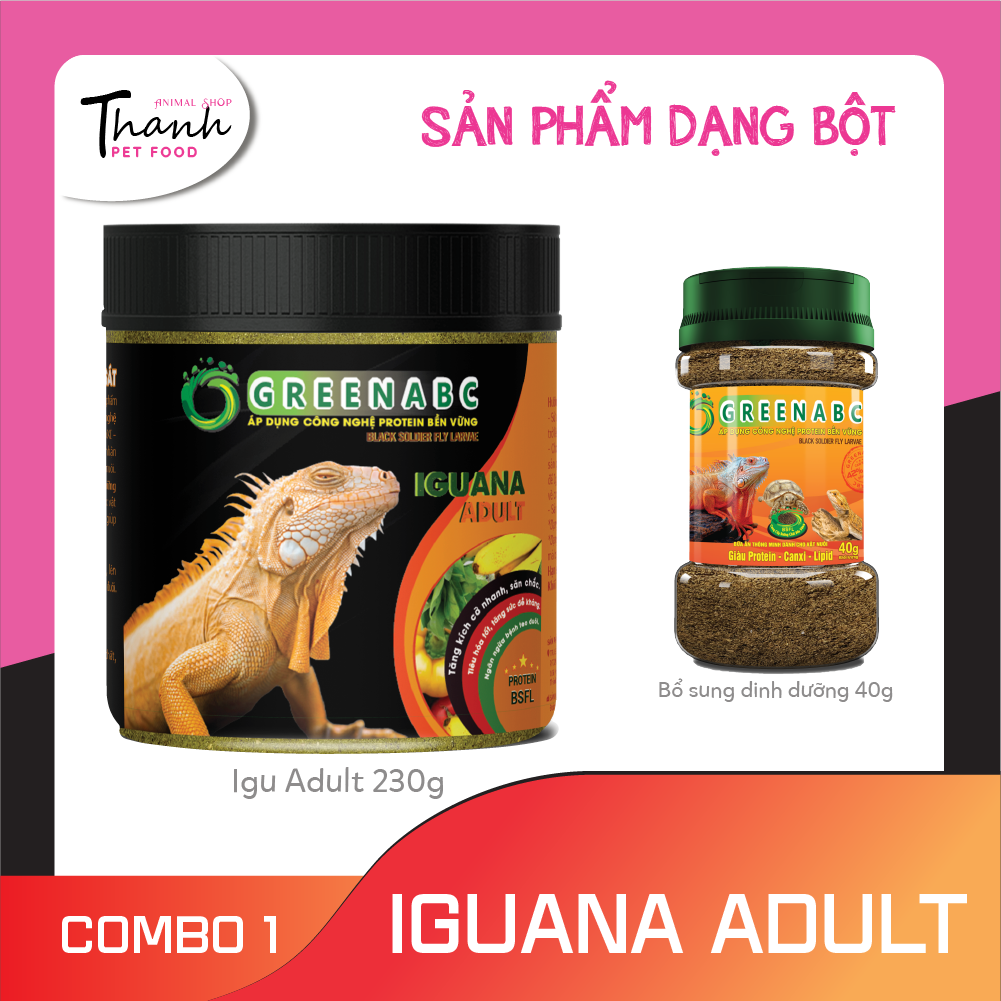 GREENABC - THỨC ĂN IGUANA TRƯỞNG THÀNH - Rồng Nam Mỹ trưởng thành từ 1m trở lên GREENABC là thức ăn cao cấp dành cho Iguana Trưởng Thành - Rồng Nam Mỹ Trưởng Thành. Đặc biệt sản phẩm GREENABC được sản xuất theo phương pháp Áp dụng công nghệ PROTEIN bền vững từ bột đạm G.Meal rất giàu PROTEIN – CANXI – LIPID có trong BSFL, đã được Mỹ (AAFCO) và EU chấp nhận đưa vào công thức cho ngành sản xuất thức ăn dành cho vật nuôi. Sản phẩm GREENABC cung cấp các giá trị dinh dưỡng bền vững cho Iguana với sự kết hợp 90% thành phần có nguồn gốc thực vật và 10% thành phần có nguồn gốc động vật từ côn trùng, giúp cho Iguana:      + Lột da thường xuyên, tăng kích cỡ nhanh, lên màu đẹp.      + Với hàm lượng Canxi 100% nguyên chất có trong BSFL giúp gai bung, đều, ngăn ngừa các bệnh thường gặp như teo đuôi, MBD, sạn,      + Kích thích khứu giác, tăng cường vị giác, giúp Iguana ăn ngon miệng hơn. Đặc biệt với hương thơm tự nhiên, Greenabc kích thích khứu giác của các Iguana Abino T-, giúp các bé ăn tốt hơn.       + Tiêu hóa tốt, cơ thể hấp thụ toàn bộ dưỡng chất cần thiết, giúp cơ thể phát triển toàn diện.      + Cơ thể săn chắc, khỏe mạnh.      + Hỗ trợ tốt trong quá trình mang thai và sinh sản, giúp Iguana hồi phục nhanh chóng sau sinh.      + Giảm thiểu mùi hôi của phân và cơ thể. Combo 1:  Combo 2:  Combo 3:  Ghi chú: Khi sử dụng combo Iguana trưởng thành 3, KHÔNG CẦN BỔ SUNG THÊM CANXI & D3 cho Igu, vì trong combo Igu trưởng thành 3 đã đầy đủ lượng Canxi cho Igu phát triển. Quý Khách Hàng sẽ SIÊU TIẾT KIỆM CHI PHÍ cho việc chăm sóc cho Igu Thành phần dinh dưỡng và hướng dẫn sử dụng: