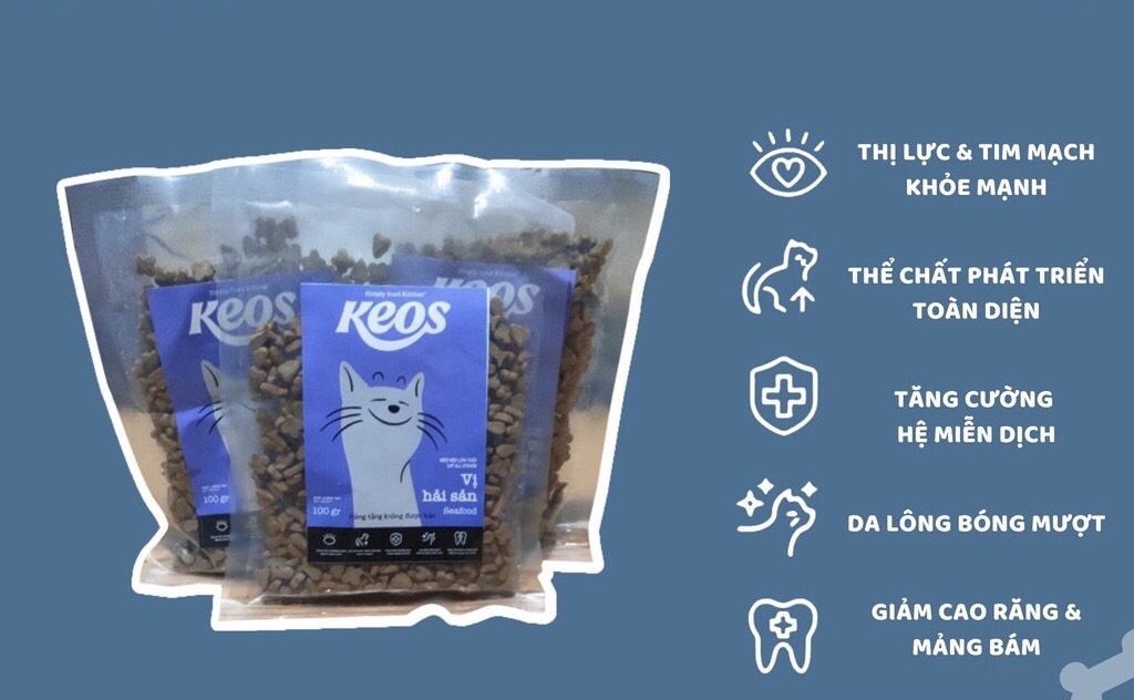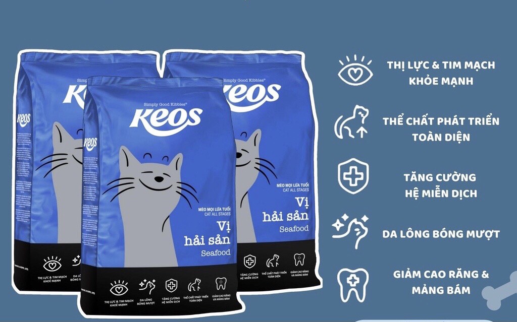 Thức ăn cho mèo mọi lứa tuổi - KEOS Seafood 1.5 KgHương vị: Hải sản+xứ: Việt NamHạn sử dụng: 1 năm kể từ ngày sản xuấtNgày sản xuất: in trên bao bì.+Công dụng:Thị lực tốt & Tim mạch khỏeThể...