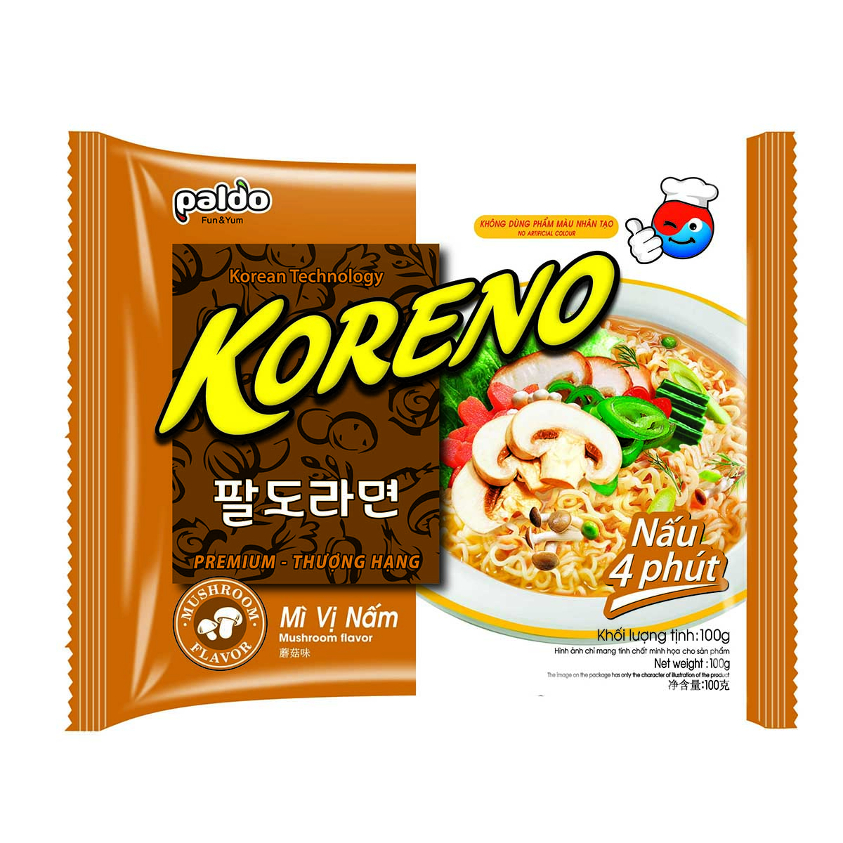 Mua tại TiktokMì Koreno vị Nấm là dòng sản phảm thế mạnh của Paldo. Sự tinh tế trong từng gói mì được cải tiến với công nghệ Hàn Quốc, đem đến độ dai giòn bóng bẩy, hòa quyện với nước dùng đặc trưng, tạo nên hương vị, mùi thơm tinh tế, quyến rũ. Gói gia vị được kết tinh từ những nguyên liệu tươi ngon nhất giúp cho hương vị hòa quyện hơn, đậm đà hơn, nước dùng chua cay, thanh ngọt phù hợp với nhiều lứa tuổi. Hướng dẫn nấu: Áp dụng cho 1 gói lẻ 100g